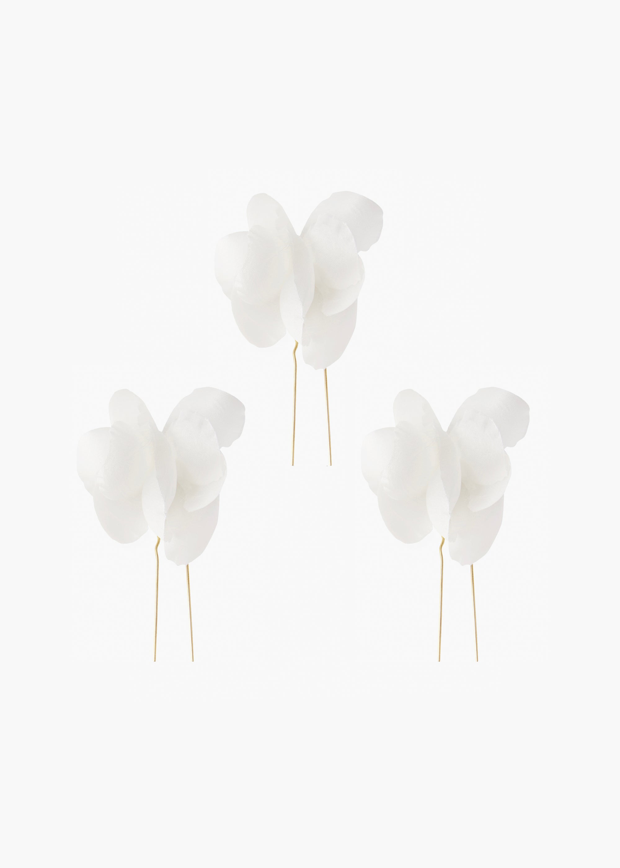 The larger counterpart to our Small Jardinia Hair Pins, this floral silhouette was inspired by the ultra-romantic elements of Pre-Raphaelite paintings. The Large Jardinia Hair Pins are a set of three, handmade in our Brooklyn studio from laser-cut silk chiffon flowers. This bouquet speaks volumes on its own, but for more drama, try wearing multiple sets at once, or pairing with the Primavera Hair Pins. Material The Large Jardinia Hair Pins are a set of three, handmade in New York of silk, on a steel hair pin, designed to stay firmly in place, once other pins have the hairstyle securely fastened. We recommend treating each pin as you would a piece of jewelry, and storing in the dust bag when not in use. Avoid contact with water, perfume, and other chemicals, including hairspray, which should be used before placement in the hair.