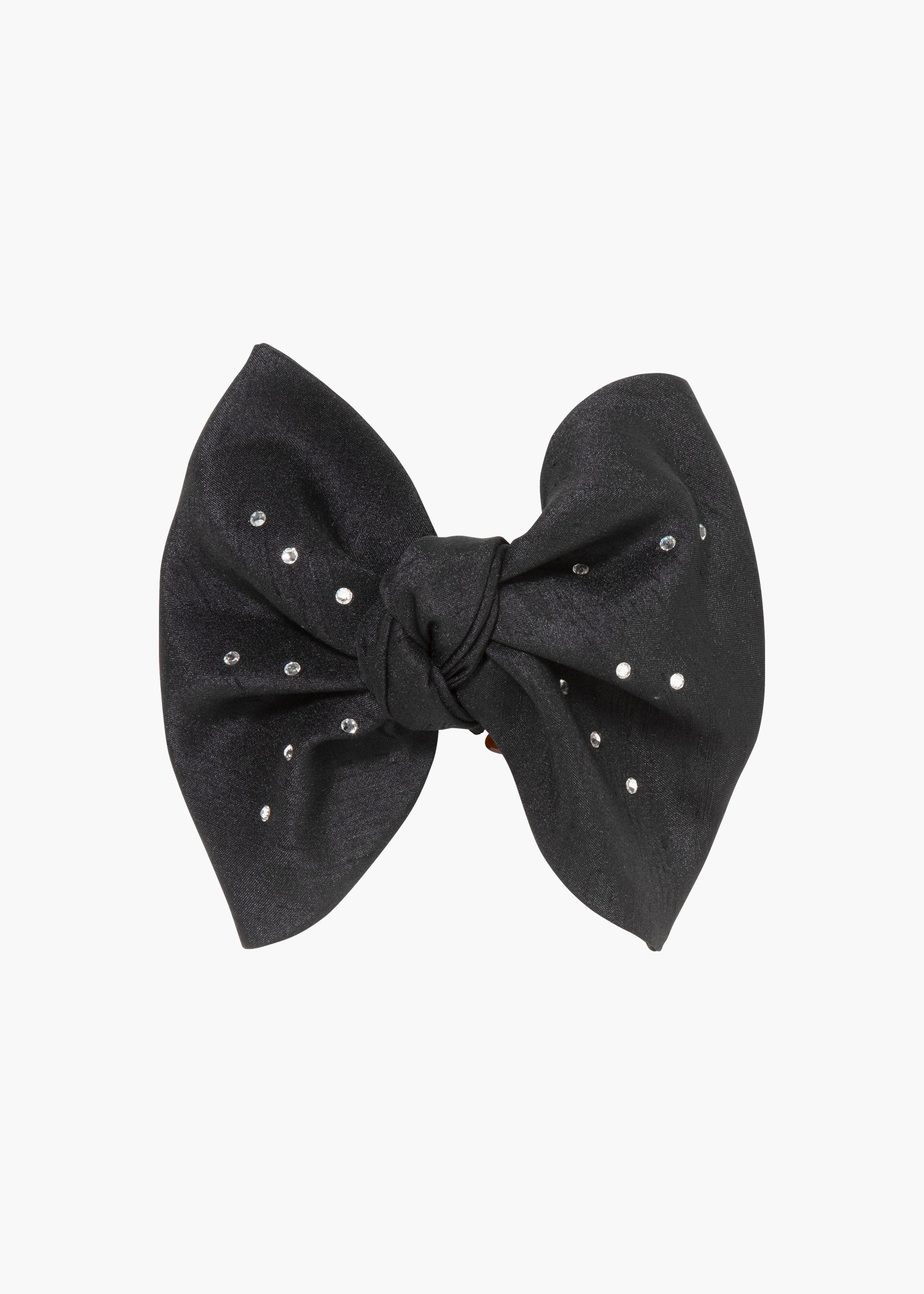 The Leonor Bow Jaw Clip sits on a convenient claw clip, offering a novel way to wear our best-selling bows. The fine silk bow is scattered with petite crystals like a starry sky. The jaw clip closure makes it a breeze to easily style a number of ways. Material The Leonor Bow Jaw Clip is made by hand in Italy of silk with Czech glass crystal embroidered embellishment, with an cellulose acetate jaw clip. We recommend treating this clip as you would a piece of jewelry, and storing in the dust bag when not in use. Avoid contact with water, perfume, and other chemicals, including hairspray, which should be used before placement in the hair.