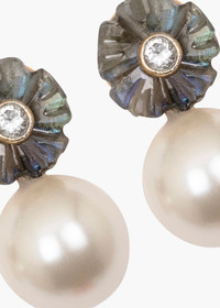 Blurring the lines between fine and costume jewelry, the Libby Earrings combine natural semi-precious stones with Austrian crystal-pearl details. The gemstones are carved by hand into a richly detailed flower shape, with contrasting crystal centers creating an expressive, painterly palette. Made by hand in New York, the unexpected color combinations, along with the scale, keep the look fresh. Dimensions: 1" Material The Libby Earrings are made by hand in New York from natural semi-precious stones, Austrian crystal pearls, and 18K gold plated brass. All stones have natural variances in color and markings that make each one unique. They have a surgical-steel post, are nickel-free and safe for sensitive skin. We recommend storing earrings in their dust bag while not in use, and avoiding contact with water, perfume, hairspray, and other chemicals.