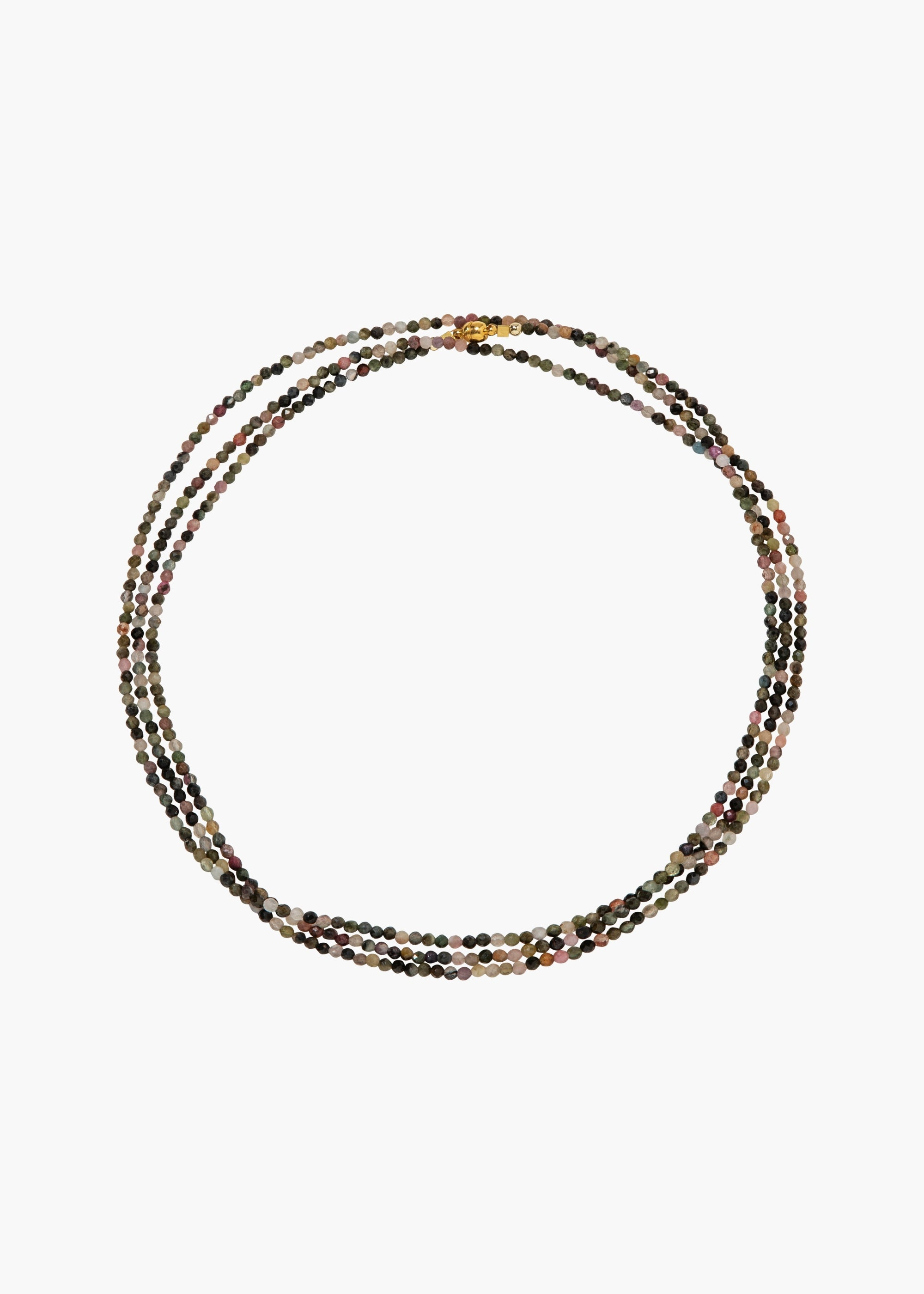Crafted entirely of finely faceted semi-precious gemstones, the Lisette Necklace highlights the idiosyncrasies of these stones that make them so special. Made by hand in New York, it's finished with a discrete 18-karat gold-plated magnetic clasp, making it possible to double or triple-wrap it around the neck for a layered effect, or even wear it wrapped around the wrist as a bracelet. This necklace layers beautifully with other semi-precious necklaces in our collection. Dimensions: 54" length Material The Lisette Necklace is handmade in New York of faceted semiprecious onyx, hasonite, green quartz or lapis lazuli gemstones with a 18K gold plated magnetic closure. All stones have natural variances in color and markings that make each one unique. We recommend storing necklaces in their dust bag while not in use, and avoiding contact with water, perfume, hairspray, and other chemicals.