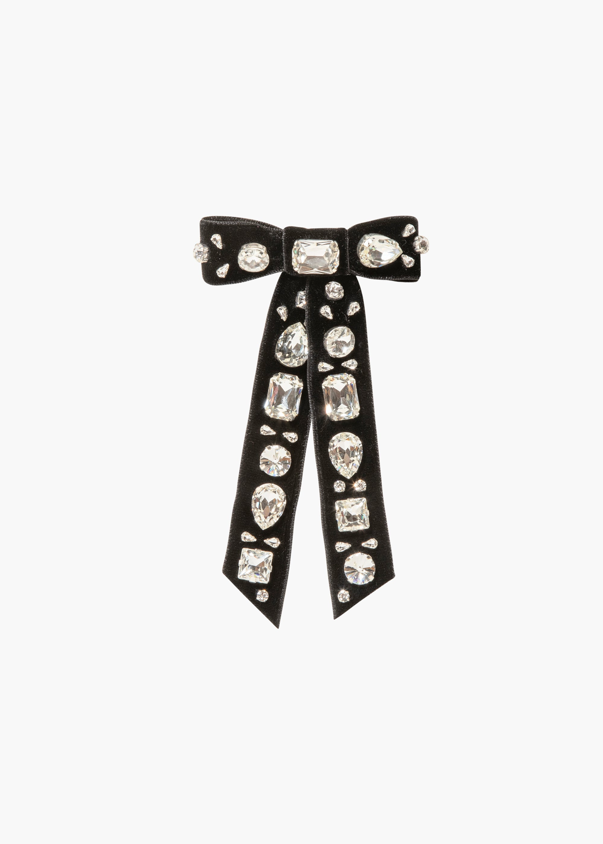 The object of our magpie-dreams, the Lucia Bow Barrette instantly quenches a thirst for sparkle. Made by hand in New York, our classic bow is hand-embroidered with a melange of fine crystals, with different shapes creating a playful mosaic-like effect. It's finished with an automatic French barrette closure, for secure, effortless placement in any hairstyle. Material The Lucia Bow Barrette is made by hand in New York from hand-embroidered gem-cut Czech crystals on a silk velvet bow, and finished with a steel French barrette closure. We recommend treating this bow as you would a piece of jewelry, and storing in the dust bag when not in use. Avoid contact with water, perfume, and other chemicals, including hairspray, which should be used before placement in the hair.