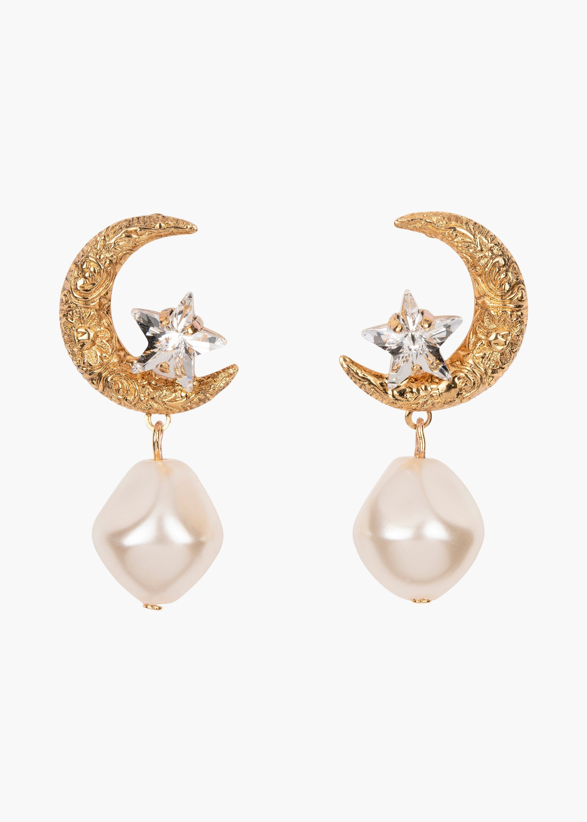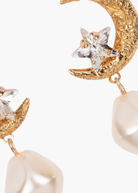 The Lune Earrings feature a gold moon with carefully carved detail. These earrings celebrate the inspiration of the moon as a symbol of femininity, wisdom, and spiritual connection. A tiny crystal star is nestled in the crook of the moon, and a baroque-style pearl adds a feminine touch. Explore more styles from The Celestial Edit . Material The Lune Earring is a post earring with a surgical-steel post. Our earrings are nickel-free and safe for sensitive skin. This earring is crafted in New York from gold-plated brass, fine quality crystals, and glass pearl. We recommend storing earrings in their dust bag while not in use, and avoiding contact with water, perfume, hairspray, and other chemicals.