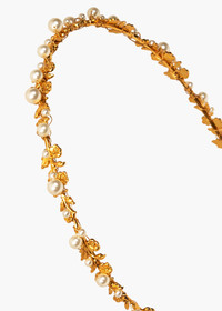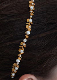 An enchanting moment, the Mae Headband is delicate enough to pair with nearly anything but special enough to make an impact. The dainty headband of 18-karat gold-plated flowers is scattered with pearl details, shaping a romantic look. The flexible headband base allows for a comfortable and secure fit. Material The Mae Headband is made in New York of 18K gold plated brass on a thin and flexible headband, which is designed to disappear in the hair and ensure hours of comfort. We recommend treating this headband as you would a piece of jewelry, and storing in the dust bag when not in use. Avoid contact with water, perfume, and other chemicals, including hairspray, which should be used before placement in the hair.