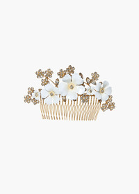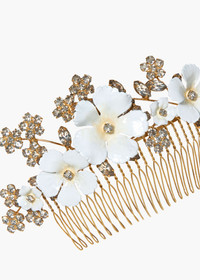 The Marveille Comb combines hand-enameled flowers and Swarovski crystals to create the effect of flower blossoms in the hair. This hair comb is gorgeous enough to stand alone, but if you're seeking a bold statement, we love it with coordinating bobby pins scattered in, such as the Violet Bobby Pins or Juliette Bobby Pins. Likewise, this comb can be worn with a veil for a bridal look, and thanks to the handmade craftsmanship, you will treasure it as an heirloom for years to come. Dimensions: 2.25 x 0.75 x 0.5 inches Weight: 40g Material The Marveille Comb is made by hand in New York of Swarovski crystal and hand-enameled flowers, on a steel comb, which is designed to stay firmly in place, once other pins have the hairstyle securely fastened. We recommend treating this comb as you would a piece of jewelry, and storing in the dust bag when not in use. Avoid contact with water, perfume, and other chemicals, including hairspray, which should be used before placement in the hair.