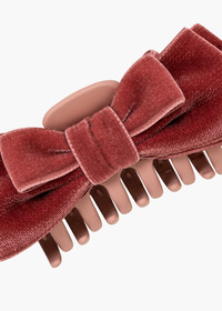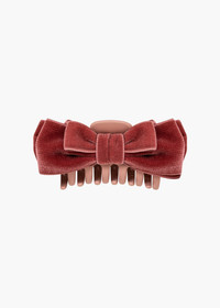 Our adored velvet bow just received the jaw-clip treatment: the Matilda Jaw Clip is the accessory you don't want to run out the door without. Luxe velvet ribbon forms graduating layers of bows, for dimension and volume. These delicious bows sit on a sturdy acrylic resin jaw clip, making it easy to sweep hair half-up, all the way back, and into any style in between. Material The Matilda Jaw Clip is made by hand in New York of velvet ribbon, with an acrylic resin claw clip. We recommend treating this clip as you would a piece of jewelry, and storing in the dust bag when not in use. Avoid contact with water, perfume, and other chemicals, including hairspray, which should be used before placement in the hair.