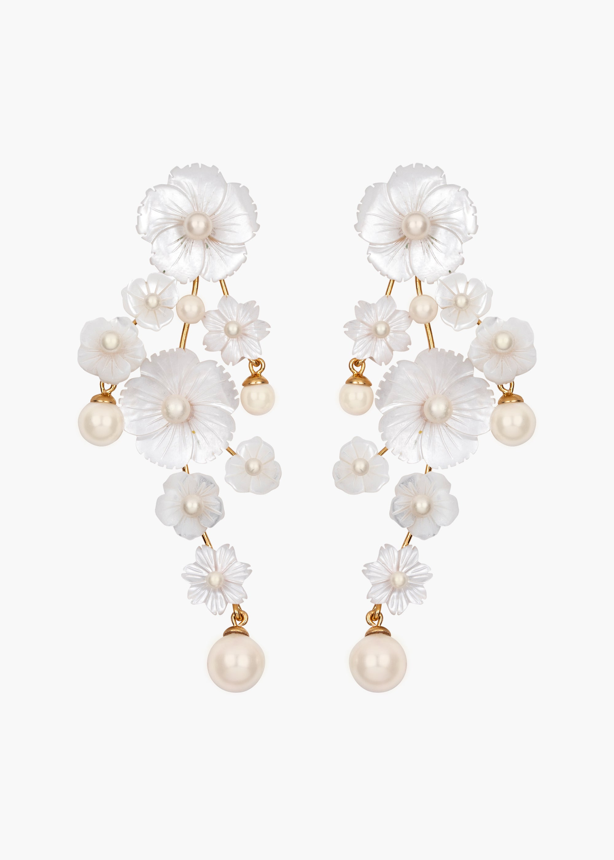 With an organic arrangement reminiscent of a bouquet of flowers, the Maxine Earrings are thoughtfully designed to compliment the lines of your face. Crafted of mother of pearl, a material we love for its soulful depth and inimitable luster, each flower is carved by hand, and, in a laborious process, hand-soldered and hand-set with pearl details at each flower's center. The look is complete with multiple dangling pearls, which create movement reminiscent of lilies of the valley swaying in the breeze. Dimensions: 3.5" length. Material The Maxine Earrings are made by hand in New York from 18K gold plated brass and mother of pearl flowers. They have a surgical-steel post, are nickel-free, and safe for sensitive skin. We recommend storing earrings in their dust bag while not in use, and avoiding contact with water, perfume, hairspray, and other chemicals.
