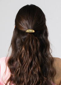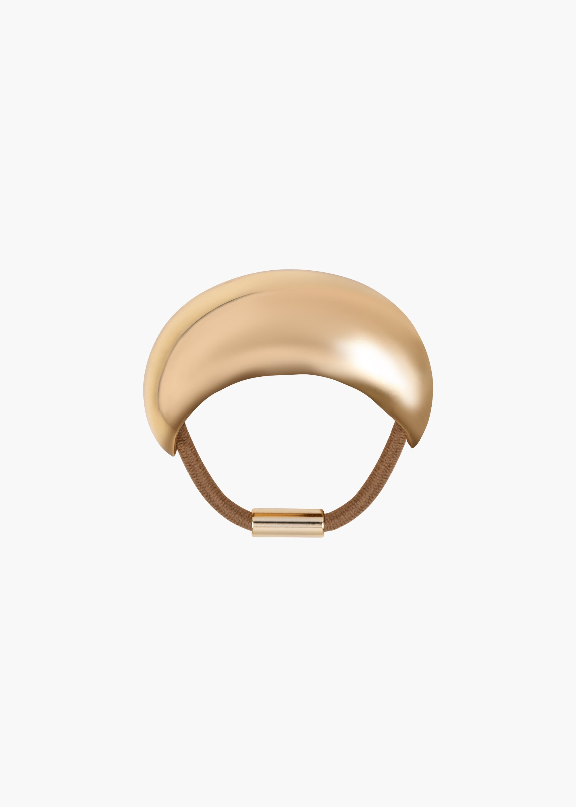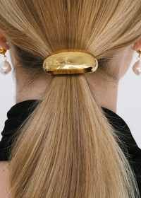 The Mona Ponywrap breathes chic new life into any ponytail. The modern, bulbous shape flawlessly sets the scene for its 18-karat-gold plated shine. We love layering multiples at once for a dramatic, bespoke look. Material The Mona Ponywrap is an 18K gold tone plated zinc ponywrap. We recommend treating this piece as you would a piece of jewelry, and storing in the dust bag when not in use. Avoid contact with water, perfume, and other chemicals, including hairspray, which should be used before placement in the hair.