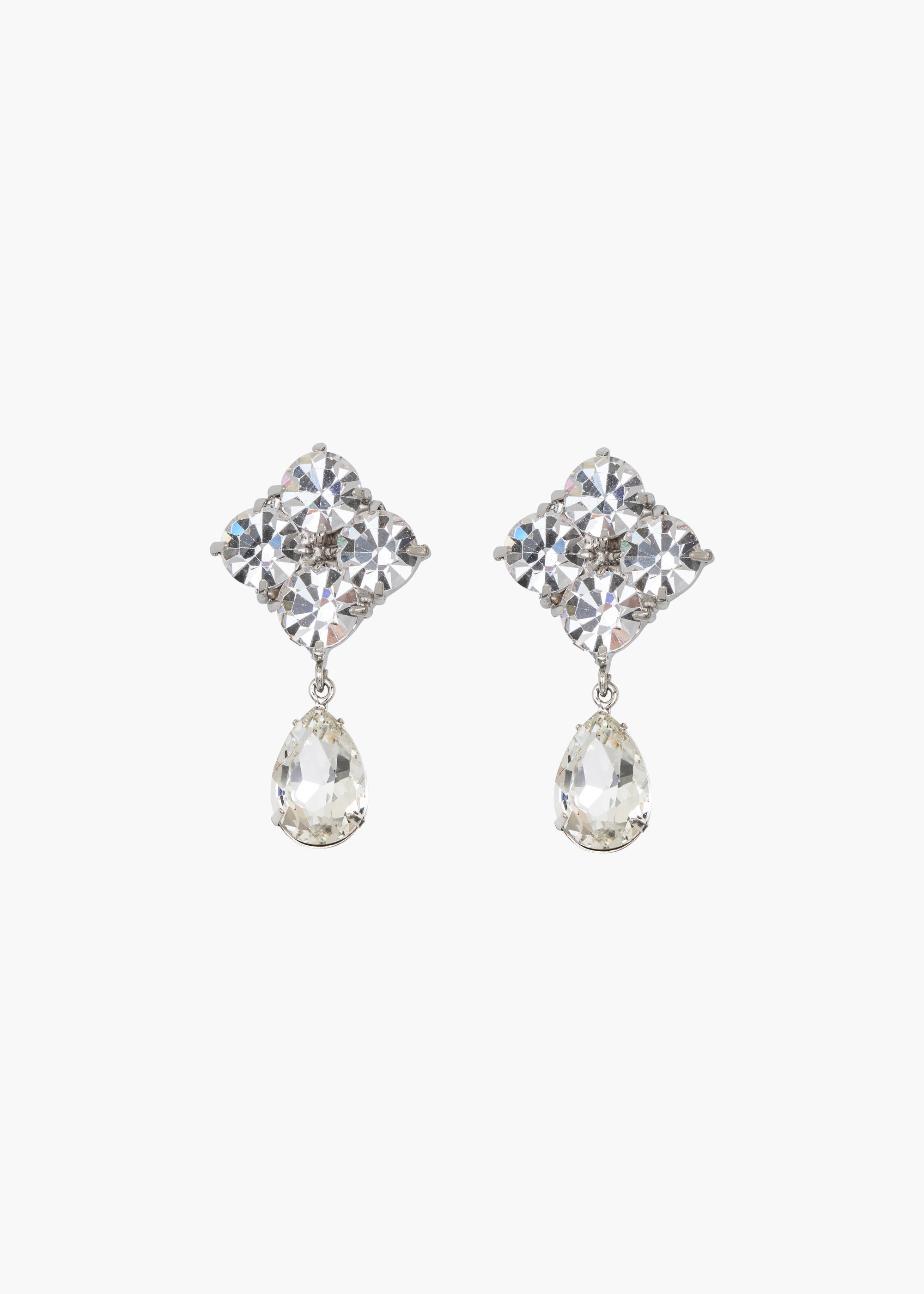 The Morgana Earrings offer an unusual twist on the classic drop earring. Made in New York of fine crystals, four gorgeously faceted round stones are grouped together, giving the appearance of a single sumptuous stone, but with even more sparkle. The look is finished with a gracefully trailing pear-cut drop. Dimensions: 1.5 inch length Material The Morgana Earrings are made by hand in New York from rhodium plated brass and crystal. They have a surgical-steel post, are nickel-free, and safe for sensitive skin. We recommend storing earrings in their dust bag while not in use, and avoiding contact with water, perfume, hairspray, and other chemicals.