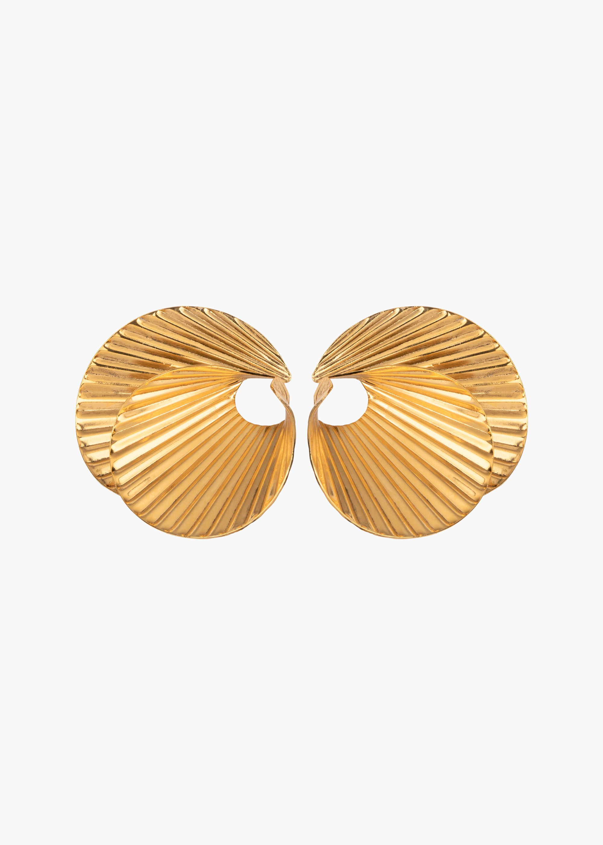A marriage of organic forms and modern glamour, the Naia Earrings emulate the ocean's waves. Made in New York, their rippled 18-karat gold-plated surface is sculpted by hand in a time-intensive process that achieves the look of wearable art. With an eye-catching fan shape, they are thoughtfully designed to frame the face. Dimensions: 1.75 inch length Material The Naia Earrings are made by hand in New York from 18K gold plated brass. They have a surgical-steel post, are nickel-free and safe for sensitive skin. We recommend storing earrings in their dust bag while not in use, and avoiding contact with water, perfume, hairspray, and other chemicals.