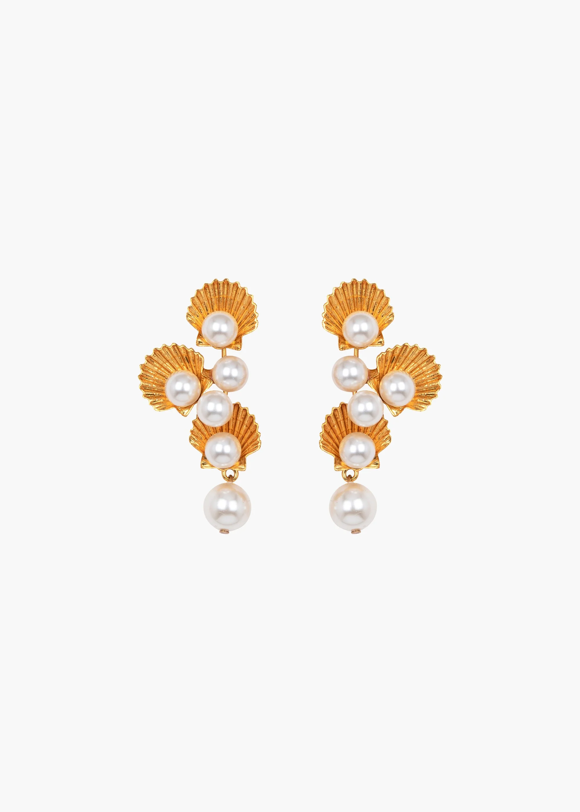 The Nerida Earrings are a face-framing drop with maritime appeal. Made by hand in New York, they feature golden scallop shells, dotted with pearls like stars in a constellation. This classic color palette will carry weight in your wardrobe for years to come. Dimensions: 1.5 inch length Material The Nerida Earrings are made by hand in New York from 18K gold plated brass and crystal pearls. They have a surgical-steel post, are nickel-free, and safe for sensitive skin. We recommend storing earrings in their dust bag while not in use, and avoiding contact with water, perfume, hairspray, and other chemicals.