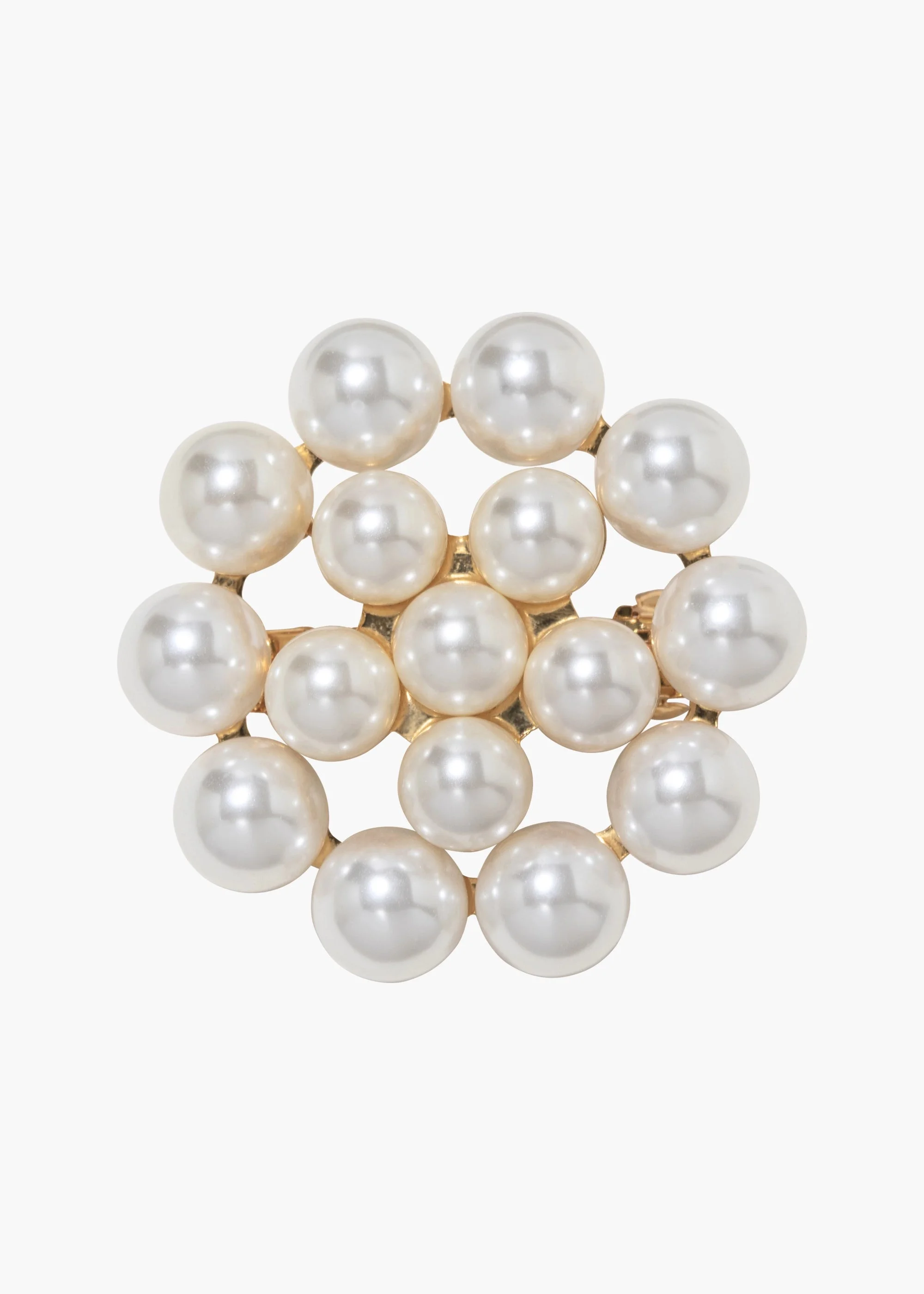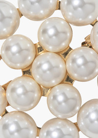 The Paige Barrette transforms any swept-back hairstyle into something polished. Made by hand in New York, each crystal pearl is carefully soldered in an 18-karat gold-plated setting. Layer multiples down the hair, or mix with our matching pearl hair accessories. It's finished with a French barrette clasp for secure placement in any hairstyle. Dimensions: 2" Diameter Material The Paige Barrette is made by hand in New York of Czech crystal pearls with a 18K gold plated French steel barrette closure. We recommend treating this barrette as you would a piece of jewelry, and storing in the dust bag when not in use. Avoid contact with water, perfume, and other chemicals, including hairspray, which should be used before placement in the hair.
