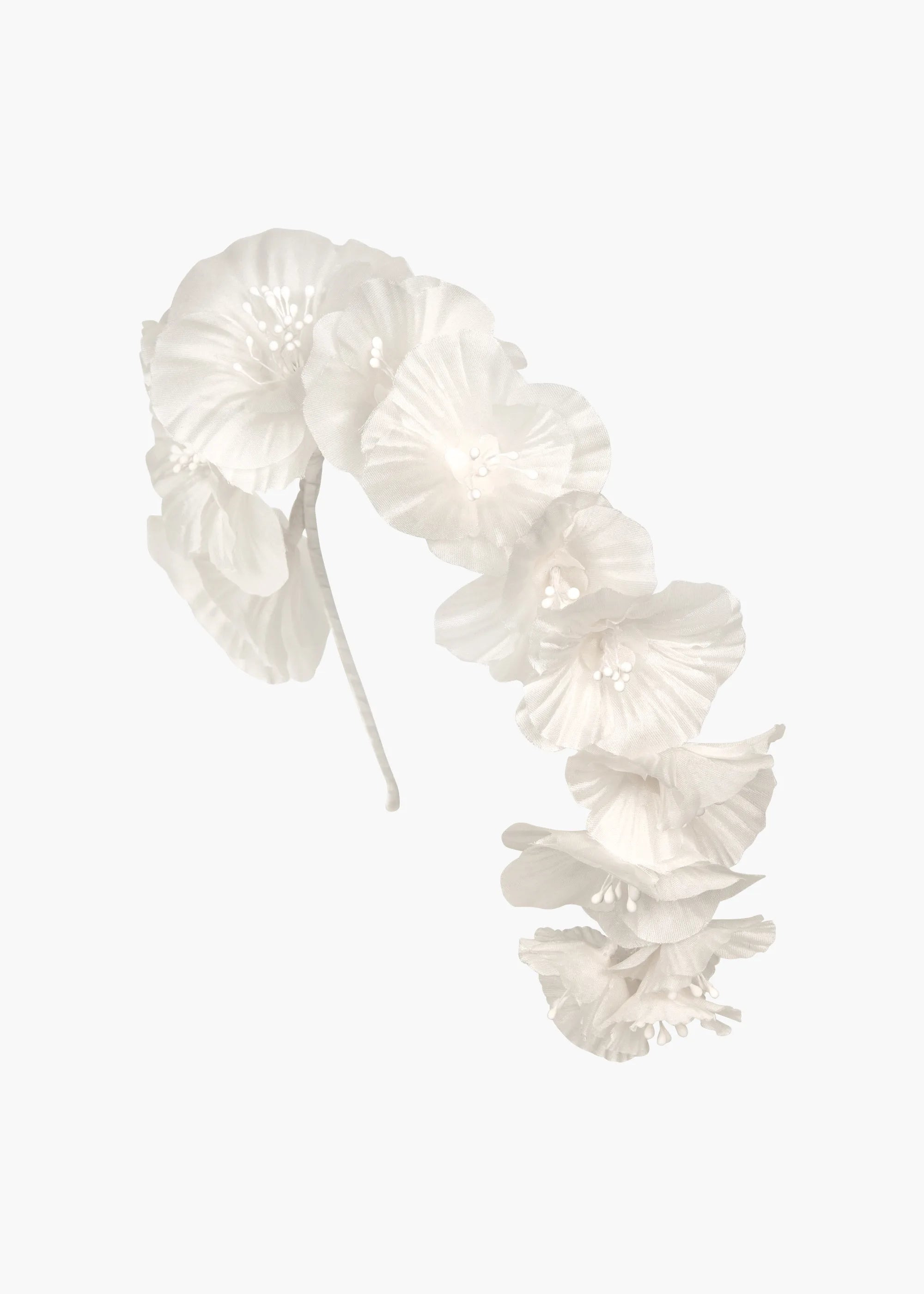 Designed to resemble a vine of peonies twisted through the hair, the Peony Vine Headband frames the face with lush florals. Crafted in New York, each flower is made by hand of silk satin-faced organza, and twisted by hand into a connected vine. With a thin silk-wrapped headband base, we love this worn to anchor a veil to a bridal look. Dimensions: 1/8in Width Headband Material The Peony Vine headband is crafted in New York from hand-made silk satin faced organza poppy vine floral motifs on a silk ribbon wrapped flexible steel base for weightless comfort. We recommend storing headbands in their dust bag while not in use. Avoid contact with water, perfume, and other chemicals, including hairspray, which should be used only before placement in the hair.