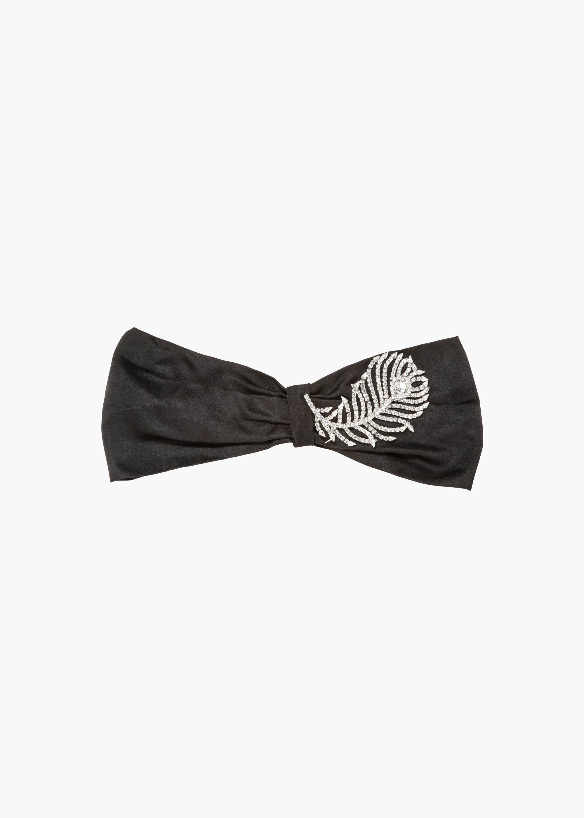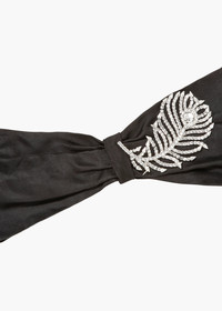 The Plume Headwrap is a lush silk headwrap adorned with a head-turning crystal peacock feather. Rendered with incredible detail, the feather appears to be in motion, a testament to its sculptural nature and handcraftsmanship. Made by hand in New York, each headwrap is draped by hand, with a covered elastic back to ensure a comfortable, flexible fit. Material The Plume Headwrap is made in New York from hand-draped silk duchesse satin with front knot detail, and a hand-made Rhodium plated Austrian crystal feather motif brooch accent. We recommend storing headwraps in their dust bag while not in use. Avoid contact with water, perfume, and other chemicals, including hairspray, which should be used only before placement in the hair.