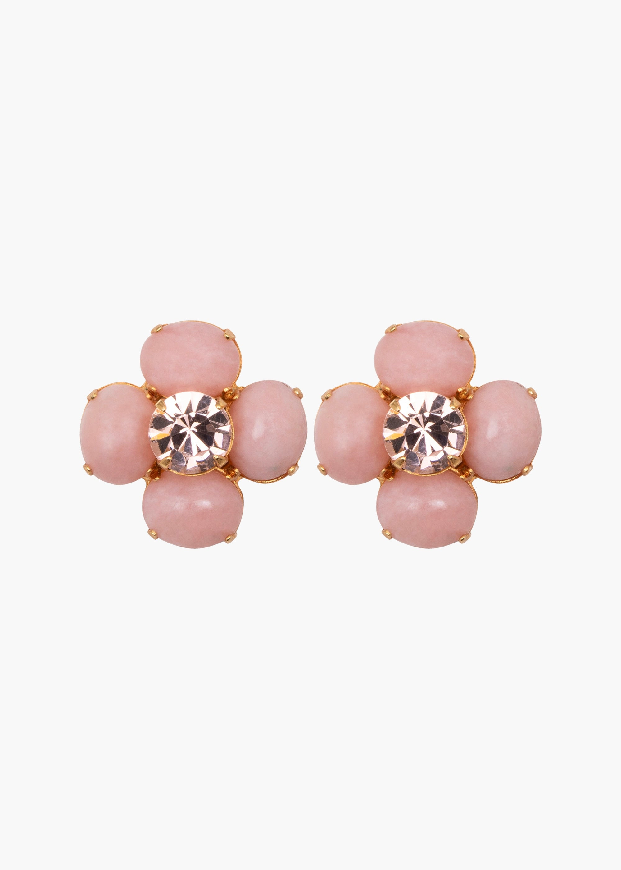 Inspired by 1960s mod florals, the Quinn Earrings are a delicious pop of color, flaunting the vivid hues of semi-precious stones like pink opal, blue agate, and red garnet. Made by hand in New York, the bubble-flower shape is achieved using cabochon gemstones for petals, with a fine Austrian crystal in the center. The stud is complete with an 18-karat gold-plated setting. Dimensions: 1" Material The Quinn Earrings are made by hand in New York from natural semi-precious stones, Austrian crystals, and 18K gold plated brass. All stones have natural variances in color and markings that make each one unique. They have a surgical-steel post, are nickel-free and safe for sensitive skin. We recommend storing earrings in their dust bag while not in use, and avoiding contact with water, perfume, hairspray, and other chemicals.