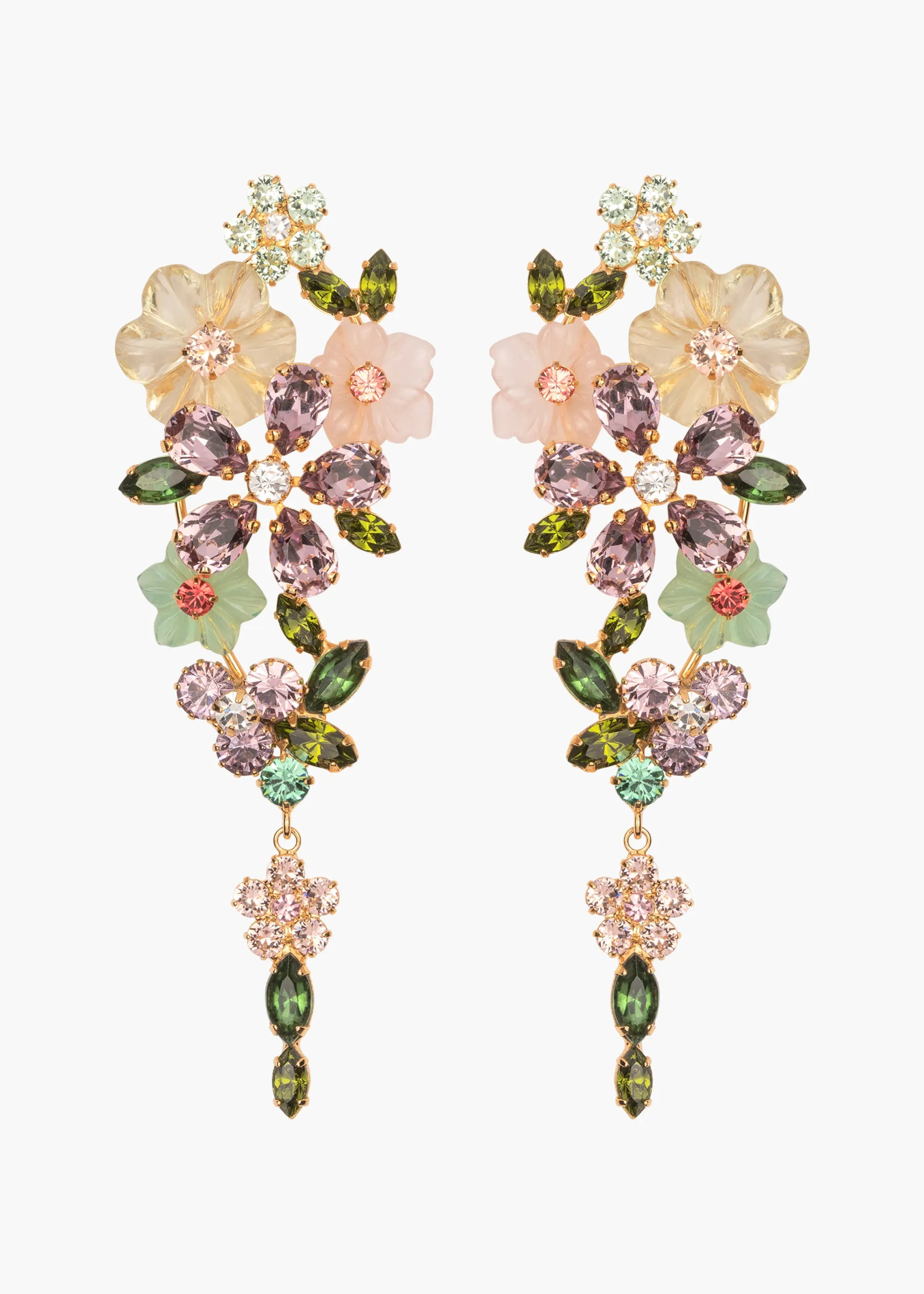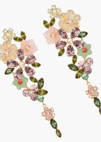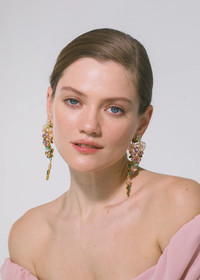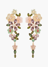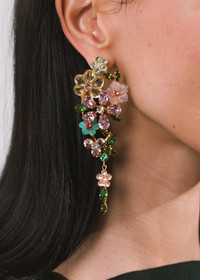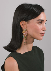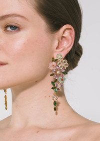 The Rafaelle Earrings blur the lines between fine jewelry and fashion jewelry, mixing semi-precious stones with fine Austrian crystals to form a wearable work of art, inspired by the work of leading floral artists. To achieve this uniquely layered bouquet look, hand-carved lemon quartz, rose quartz, and aventurine is embedded amongst crystal flowers, in a handmade 18-karat gold-plated setting, complete with a drop that gently sways. Made by hand in New York, the subtle placement of each flower is carefully considered during the design process to give a face-framing effect. Dimensions: 4in x 1 3/8in Material The Rafaelle Earrings are made by hand in New York from 18K gold plated brass and hand-carved semi-precious Lemon Quartz, Rose Quartz, and Aventurine floral motifs with Austrian crystal floral motif accents. All stones have natural variances in color and markings that make each one unique. They have a surgical-steel post, are nickel-free, and safe for sensitive skin. We recommend storing earrings in their dust bag while not in use, and avoiding contact with water, perfume, hairspray, and other chemicals.