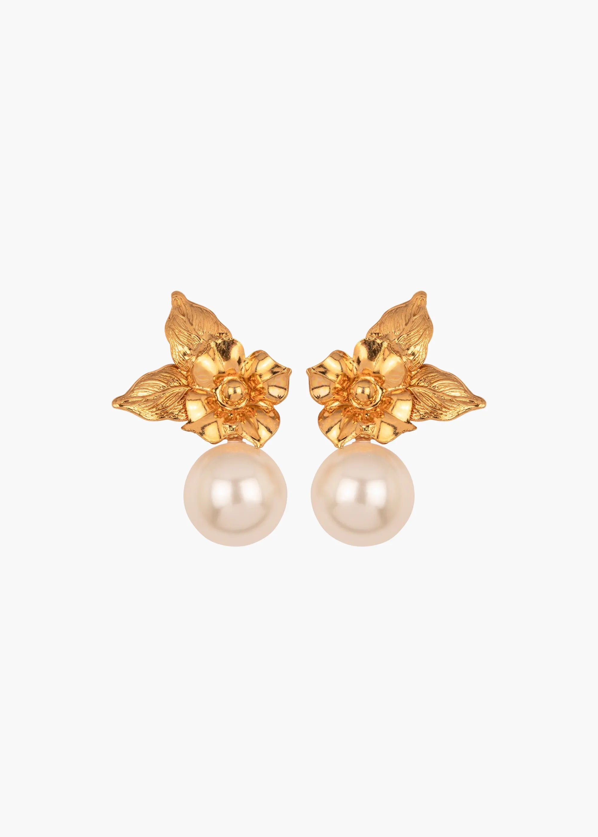 The Rici Earrings are a golden twist on our best-selling Vivi Earrings. Made by hand in New York, the 18-karat gold-plated floral motif is rich with lifelike detail. Finished with an Austrian crystal pearl drop, these earrings will take you anywhere. Dimensions: 1 1/4in x 7/8in Material The Rici Earrings are made by hand in New York from 18K gold plated brass and Austrian crystal pearls. They have a surgical-steel post, are nickel-free, and safe for sensitive skin. We recommend storing earrings in their dust bag while not in use, and avoiding contact with water, perfume, hairspray, and other chemicals.