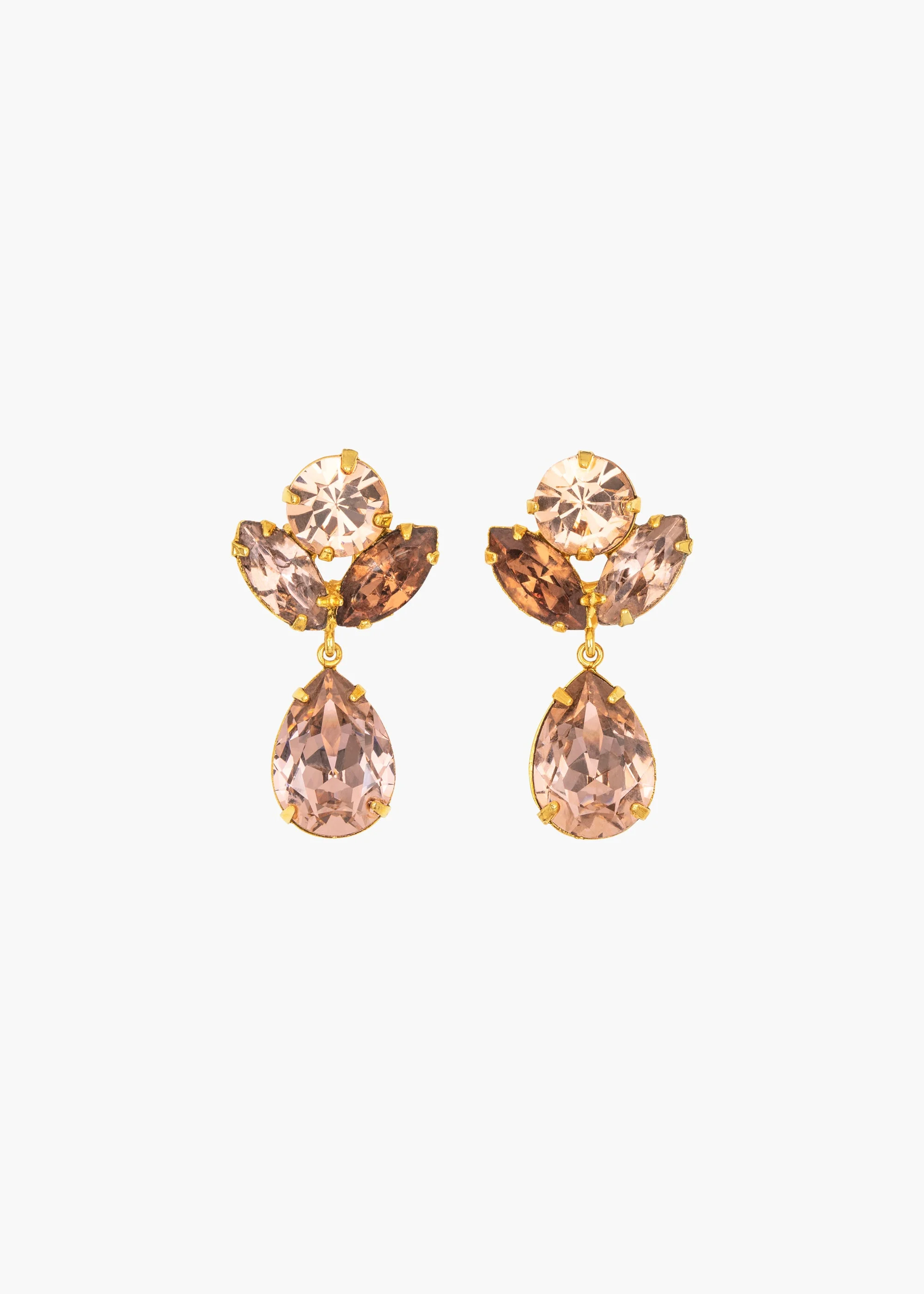 Blooming with subtle sophistication, the Rily Earrings feature a petite trio of crystals that appear almost like an abstract flower, with a gracefully trailing pear-cut drop. Versatile enough to elevate an evening gown or add a touch of glamour to a tailored suit, the Rily Earrings are sure to be a lasting staple in your jewelry collection. Material The Rily Earring is a post earring with a surgical-steel post. Our earrings are nickel-free and safe for sensitive skin. These earrings are made by hand in New York, from 18K gold plated brass and fine Czech crystals. We recommend storing earrings in their dust bag while not in use, and avoiding contact with water, perfume, hairspray, and other chemicals.