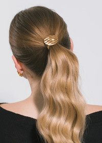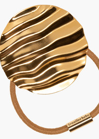 Made by hand in New York, the Rio Ponywrap is crafted from 18-karat gold-plated brass, complete with a Japanese elastic, specifically selected for its strength and stretch. Thanks to its smaller scale, this ponywrap works especially well securing half-up, half-down styles, or at the bottom of a braid. We love layering multiples at once, or mixing with other ponywraps in our collection for a bespoke look. Dimensions: 1 1/2in x 1 3/8in Material The Rio Ponywrap is made by hand in New York from 18K gold plated brass with an elastic closure. We recommend treating this piece as you would a piece of jewelry, and storing in the dust bag when not in use. Avoid contact with water, perfume, and other chemicals, including hairspray, which should be used before placement in the hair.