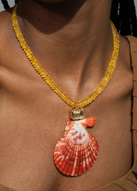 Seeped in beachside romance and wanderlust, the Roma Necklace features a genuine scallop seashell on a strand of faceted semi-precious stones, subtly graduated in size. This piece is designed to showcase a natural wonder in all its glory, with edges that are polished to rest comfortably on the neck. Made by hand in New York, each individual shell has been selected for its unique features, making each necklace one-of-a-kind. Dimensions: 17 inch length Material The Roma Necklace is handmade in New York of hand-carved semiprecious coral, citrine, or turquoise gemstones with a natural seashell and Czech crystal pendant, and 18K gold plated brass T-bar and loop clasp. All stones and shells have natural variances in color and markings that make each one unique. We recommend storing necklaces in their dust bag while not in use, and avoiding contact with water, perfume, hairspray, and other chemicals.
