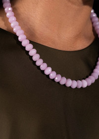 Strung with faceted semi-precious lilac jade stones, the Rora Necklace succinctly illuminates the beauty of this rare gemstone, which is known as "the stone of the angels" for its connection to divine energy. Its icy lilac tone offers a fun touch of color and is surprisingly versatile, pairing well with similarly muted pastels, vibrant hues, and earthy neutrals like camel, terracotta, and more. Complete with 18-karat gold-plated details, the length is adjustable with an extender chain, making this especially easy to stack and layer with other semi-precious necklaces in our collection. Material The Rora Necklace is made by hand in New York of lilac jade beads with a 1.5" gold plated extender with lobster clasp closure. All lilac jade have natural variances in color and markings that make each one unique. We recommend storing necklaces in their dust bag while not in use. Avoid contact with water, perfume, and other chemicals, including hairspray and lotion, which should be used before placement on the body.