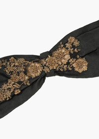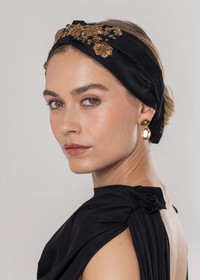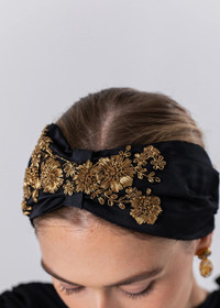 The Safina Headwrap boldly weilds the magic of gold bullion embroidery to create a wholly unique look. Made by hand in New York, it is hand-embroidered with gold bullion thread, a hollow and coiled golden metal wire with a three-dimensional quality that enhances the metal's shine. The silk double-faced duchesse satin is draped by hand, with a covered elastic back to ensure a comfortable, flexible fit. Material The Safina Headwrap is made in New York from hand-draped silk duchesse satin, featuring a hand-embroidered gold bouillon floral motif and gathered knot accent. We recommend storing headwraps in their dust bag while not in use. Avoid contact with water, perfume, and other chemicals, including hairspray, which should be used only before placement in the hair.