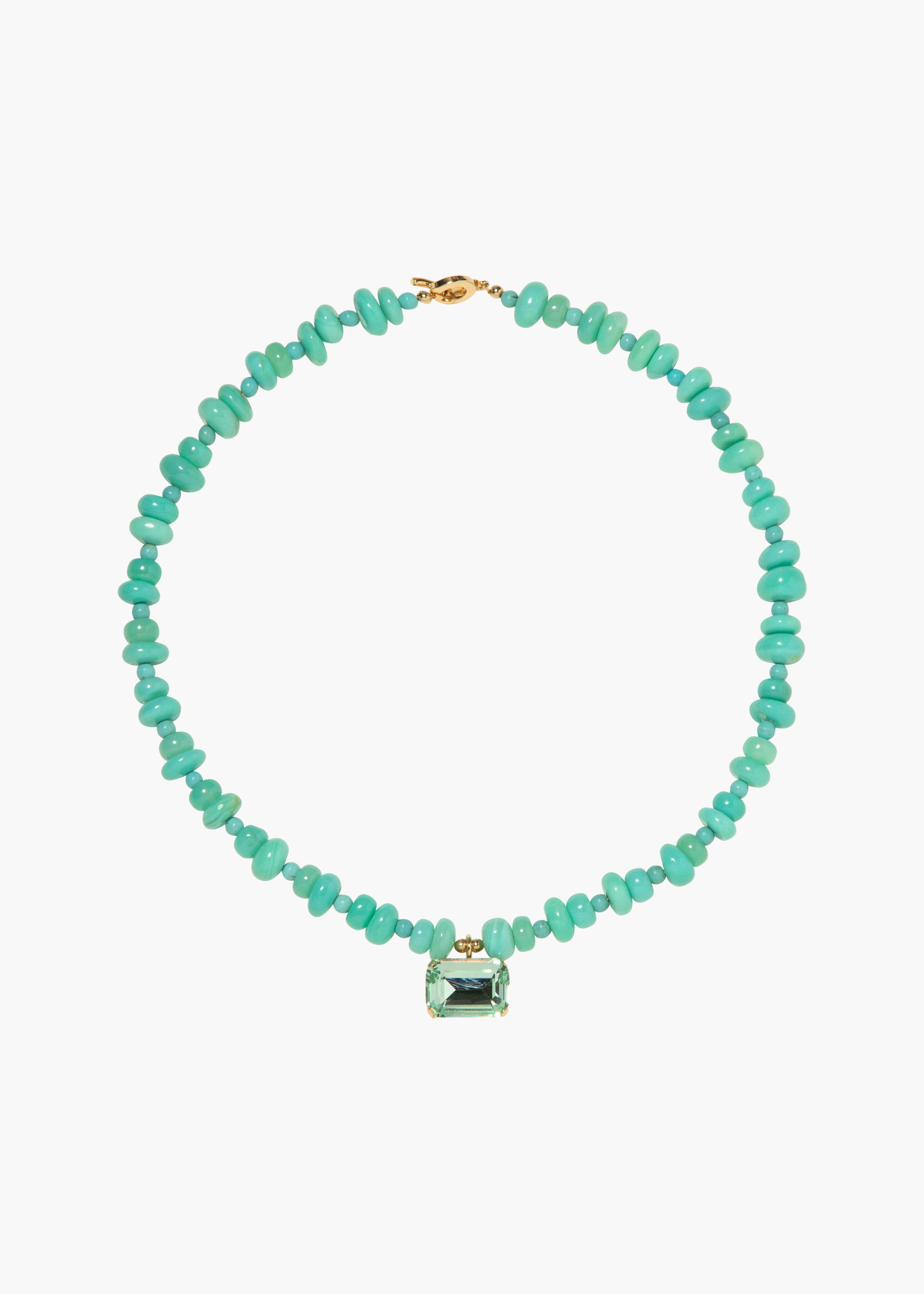 An endlessly stackable piece, the Salerno Necklace captures the carefree essence of summer. Available in a selection of semi-precious gemstones, including chrysoprase and carnelian, each bead is hand-polished to create a glossy surface, and sorted by hand in alternating sizes to form a graphic pattern. Made in New York, it is finished with an emerald-cut crystal pendant, playfully set horizontally, and a T-bar clasp. Dimensions: 19 inch length Material The Salerno Necklace is handmade in New York of hand-carved semiprecious carnelian, citrine, or chrysoprase gemstones with a 18K gold plated Czech crystal pendant and T-bar and loop clasp. All stones have natural variances in color and markings that make each one unique. We recommend storing necklaces in their dust bag while not in use, and avoiding contact with water, perfume, hairspray, and other chemicals.