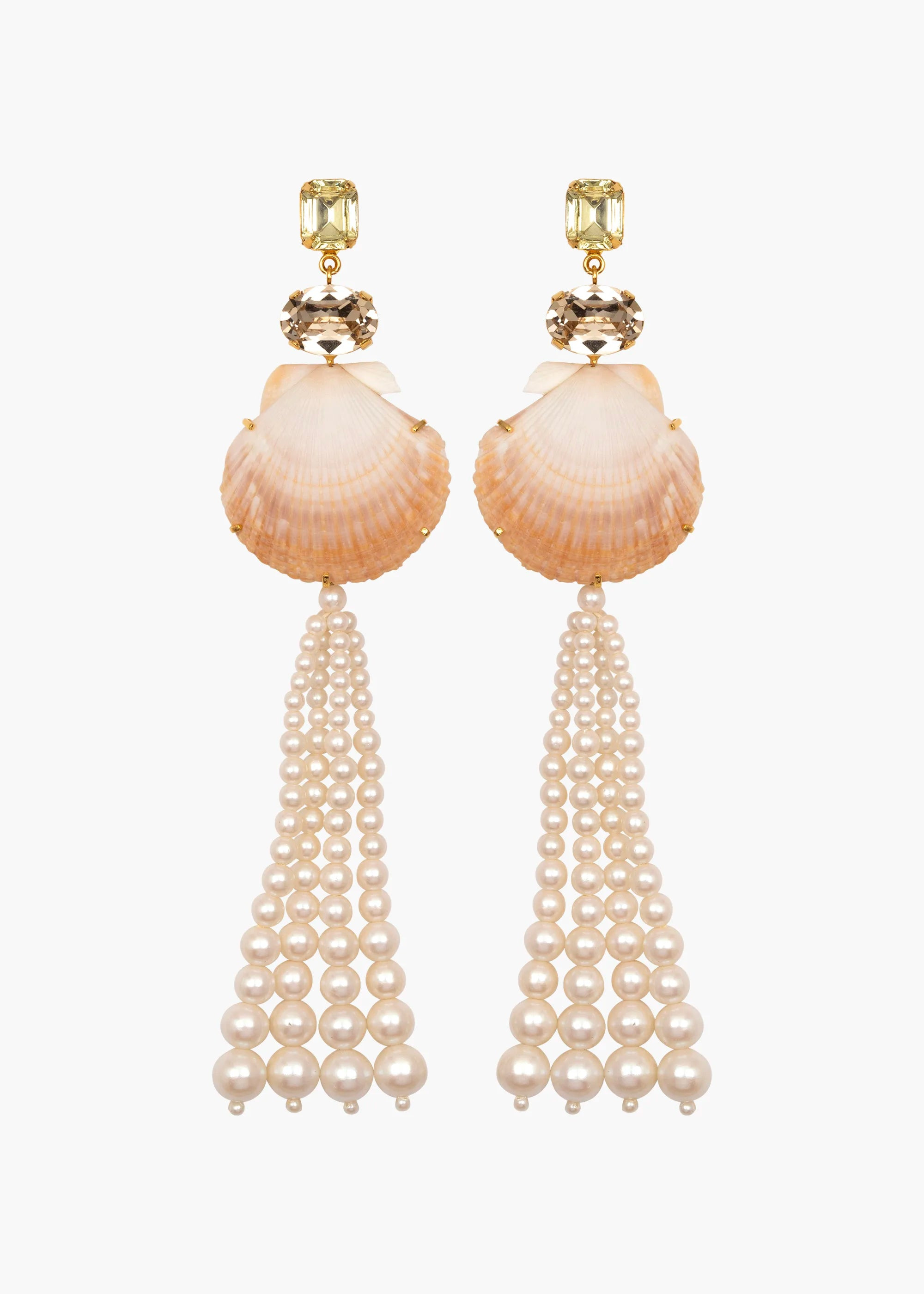 A poetic amalgamation of eclectic materials, the Sanibel Earrings channel the excitement of a seaside getaway. Made by hand in New York with fine crystals and genuine scallop seashells, the hand-formed setting is crafted using fine jewelry techniques so as not to interrupt the shell's organic silhouette. They are finished with vintage Japanese pearl tassels, with strands of pearls graduated in size for added impact. Dimensions: 5 3/8 inch length Material The Sanibel Earrings are made by hand in New York from Czech crystals, natural seashells, and a vintage crystal pearl tassel. All shells have natural variances in color and markings that make each one unique. They have a surgical-steel post, are nickel-free and safe for sensitive skin. We recommend storing earrings in their dust bag while not in use, and avoiding contact with water, perfume, hairspray, and other chemicals.