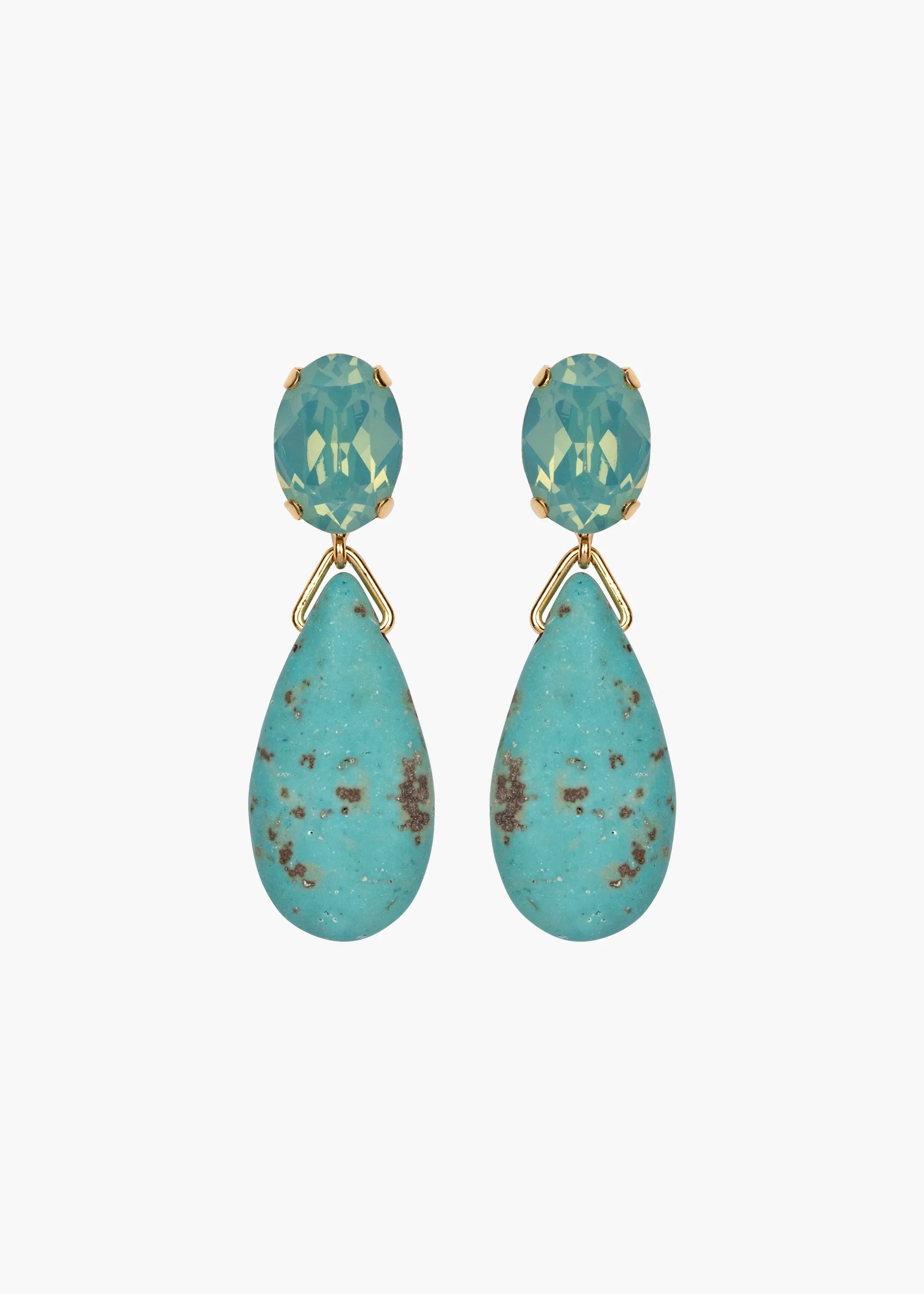The Sanremo Earrings capture the essence of our latest collection, which leans heavily on the magic found when combining organic found materials with sparkling crystals. They feature semi-precious turquoise in an oversized teardrop shape, suspended from an opalescent crystal. We love turquoise for the natural variations found in each stone, which means no two pairs are entirely alike. Dimensions: 1 3/4 inch length Material The Sanremo Earrings are made by hand in New York from semi-precious turquoise stone drops and Czech crystals. All stones have natural variances in color and markings that make each one unique. They have a surgical-steel post, are nickel-free and safe for sensitive skin. We recommend storing earrings in their dust bag while not in use, and avoiding contact with water, perfume, hairspray, and other chemicals.