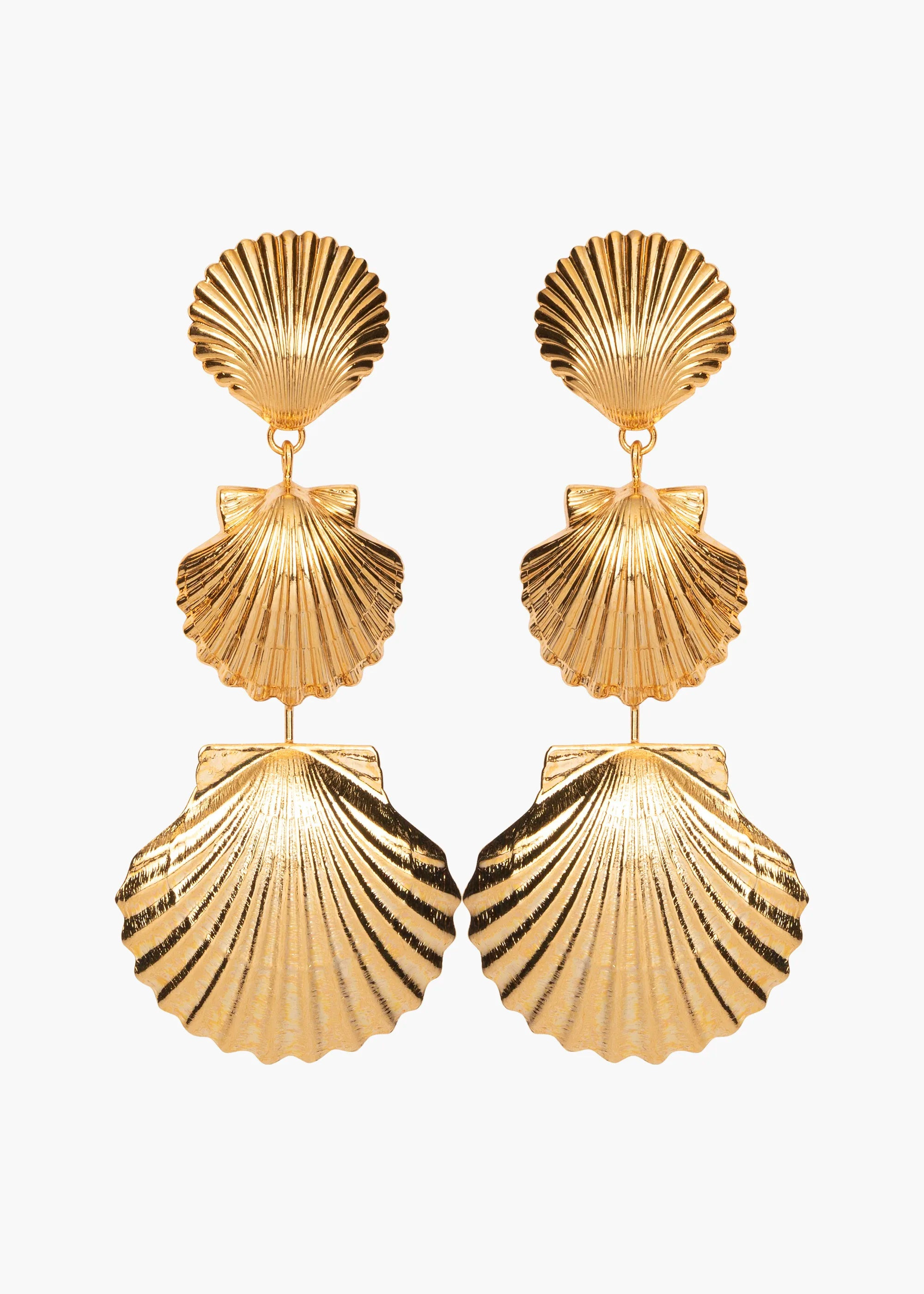 With golden scallops graduated in size, the Selkie Earrings conjure fond memories of collecting shells on a seashore. Made by hand in New York, they are plated with 18-karat gold for exceptional luster. These linear pendant earrings have a graceful oscillating movement that harmoniously syncs with your every motion. Dimensions: 3 1/4 inch length Material The Selkie Earrings are made by hand in New York from 18K gold plated brass. They have a surgical-steel post, are nickel-free and safe for sensitive skin. We recommend storing earrings in their dust bag while not in use, and avoiding contact with water, perfume, hairspray, and other chemicals.