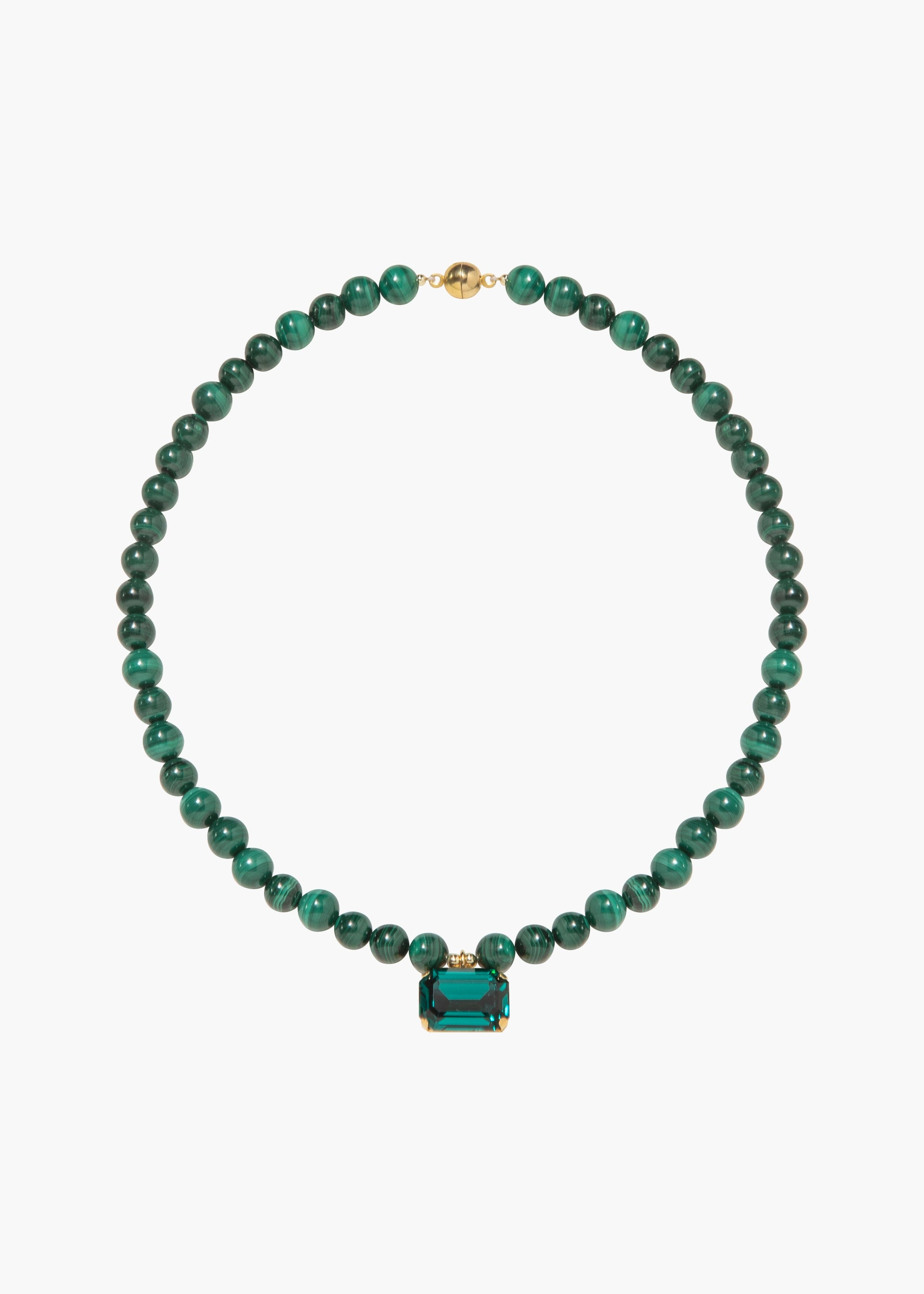 The Sidonie Necklace features natural semi-precious malachite beads, with an emerald-cut Austrian crystal pendant, chosen to complement the stones' natural hue. With its distinctive natural veining that makes each piece unique, malachite is known as the "stone of transformation," used for deep energy cleansing. It's finished with an 18-karat gold-plated magnetic clasp, making it particularly easy to wear, whether worn solo or layered in a stack. Dimensions: 17 1/2in x 3/8in (3/4in x 1/2in pendant) Material The Sidonie Necklace is handmade in New York of hand-carved semiprecious labradorite, rhodonite, hasonite, malachite, or lapis lazuli gemstones with a 18K gold plated Austrian crystal pendant and magnetic closure. All stones have natural variances in color and markings that make each one unique. We recommend storing necklaces in their dust bag while not in use, and avoiding contact with water, perfume, hairspray, and other chemicals.