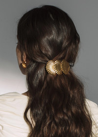 The Siren Barrette is the ideal vacation companion that will take you anywhere, from poolside to nights out. Plated with 18-karat gold, it features three layered scallop shells, rendered with impressive realism. Each barrette is made by hand in New York and complete with an automatic French barrette clasp for easy placement in the hair. Height: 3 3/8 inch Width: 1 7/8 inch Length: 2 3/4 inch Material The Siren Barrette is made by hand in New York of 18K gold plated brass with a French steel barrette closure. We recommend treating this barrette as you would a piece of jewelry, and storing in the dust bag when not in use. Avoid contact with water, perfume, and other chemicals, including hairspray, which should be used before placement in the hair.
