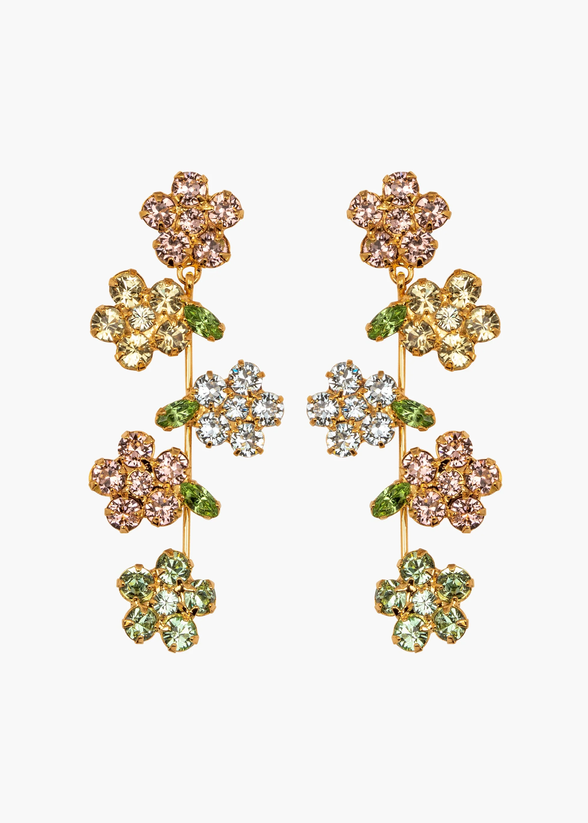 As sophisticated as they are glamorous, the Verity Earrings are a climbing vine of crystal flowers. Made by hand in New York, each individual petal and leaf are meticulously set by hand to create a sublime shimmer. They are suspended on a fine wire, which all but disappears, giving the illusion of flowers magically adrift. Material The Verity Earrings are made by hand in New York from 18K gold plated brass and crystals. They have a surgical-steel post, are nickel-free, and safe for sensitive skin. We recommend storing earrings in their dust bag while not in use, and avoiding contact with water, perfume, hairspray, and other chemicals.