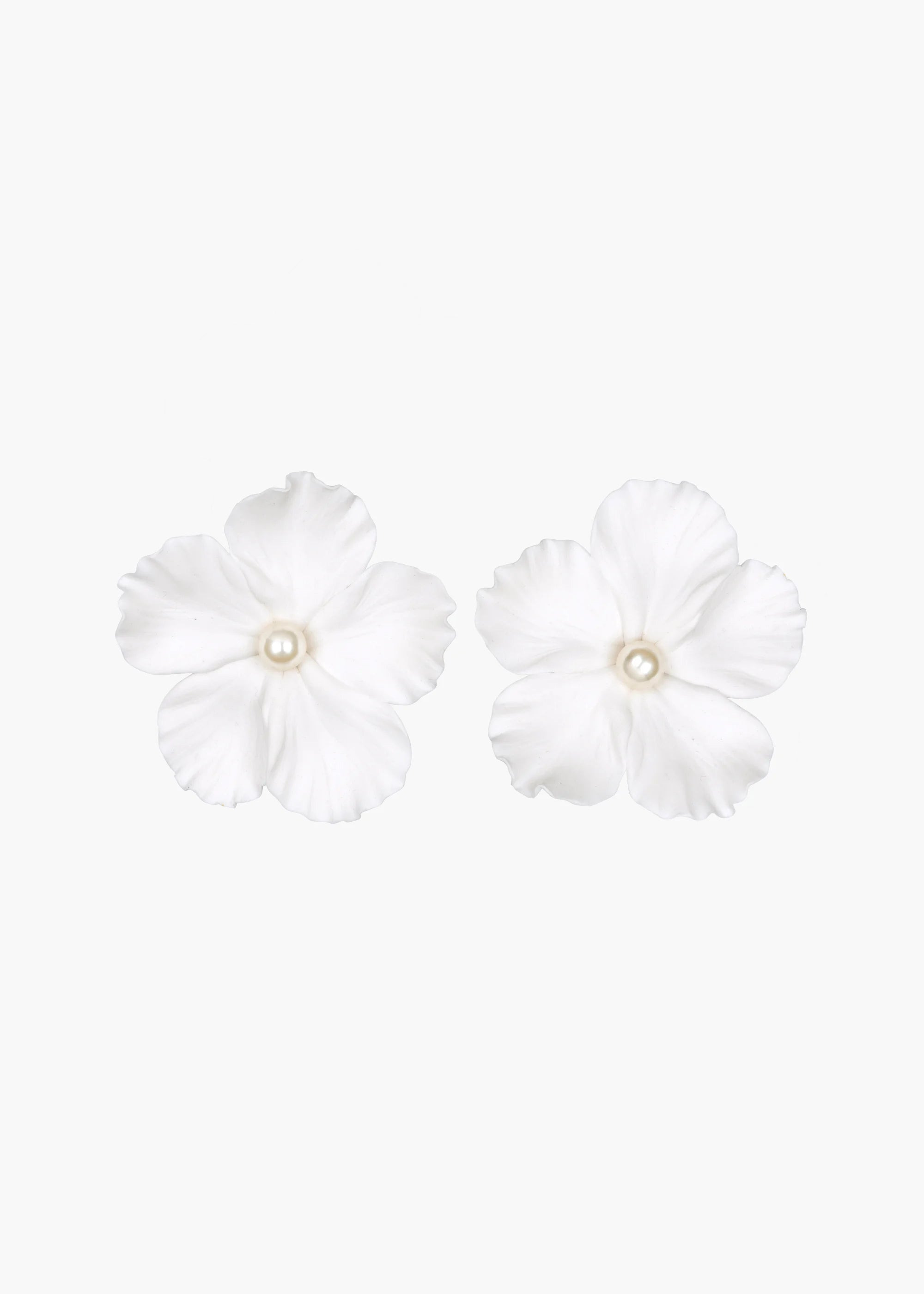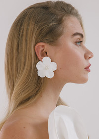 A dramatic, oversized flower, the Verone Earrings are hand-pressed from polymer clay. Their ridged surface is intricate and organic, calling to mind petals rippling in the breeze. These romantic earrings look fresh worn with a structured silk dress or top. Dimensions: 2.25" in length, 2" in width. Material The Verone Earrings are made by hand in New York from Ukrainian hand pressed polymer flowers with Czech crystal pearl centers. They have a surgical-steel post, are nickel-free, and safe for sensitive skin. We recommend storing earrings in their dust bag while not in use, and avoiding contact with water, perfume, hairspray, and other chemicals.