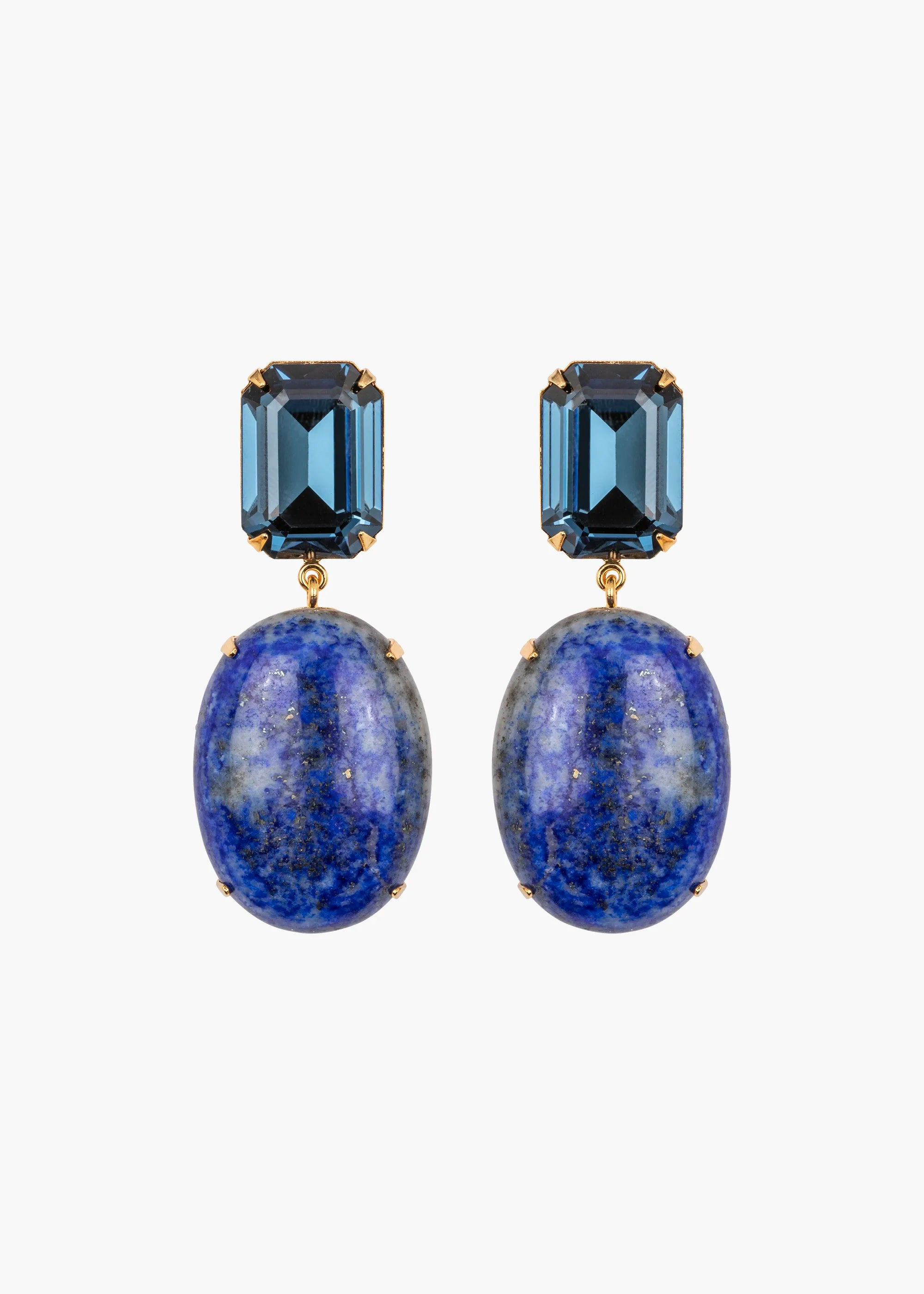 An incredibly memorable drop earring, the Xiomara Earrings are a celebration of natural semi-precious stones. Made by hand in New York in an 18-karat gold-plated setting, the cabochon gemstones (carnelian, tiger's eye, malachite or lapis lazuli) are large enough to highlight the idiosyncrasies that make each stone unique, from the variations in color to the veining, underscoring a pattern forged by nature. Standing in contrast to the organic beauty of the semi-precious material is a perfect emerald-cut Austrian crystal. Dimensions: 2in x 7/8in Material The Xiomara Earrings are made by hand in New York from 18K gold plated brass and Austrian crystals with natural semi-precious stone drops. All stones have natural variances in color and markings that make each one unique. They have a surgical-steel post, are nickel-free, and safe for sensitive skin. We recommend storing earrings in their dust bag while not in use, and avoiding contact with water, perfume, hairspray, and other chemicals.