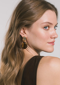 An incredibly memorable drop earring, the Xiomara Earrings are a celebration of natural semi-precious stones. Made by hand in New York in an 18-karat gold-plated setting, the cabochon gemstones (carnelian, tiger's eye, malachite or lapis lazuli) are large enough to highlight the idiosyncrasies that make each stone unique, from the variations in color to the veining, underscoring a pattern forged by nature. Standing in contrast to the organic beauty of the semi-precious material is a perfect emerald-cut Austrian crystal. Dimensions: 2in x 7/8in Material The Xiomara Earrings are made by hand in New York from 18K gold plated brass and Austrian crystals with natural semi-precious stone drops. All stones have natural variances in color and markings that make each one unique. They have a surgical-steel post, are nickel-free, and safe for sensitive skin. We recommend storing earrings in their dust bag while not in use, and avoiding contact with water, perfume, hairspray, and other chemicals.