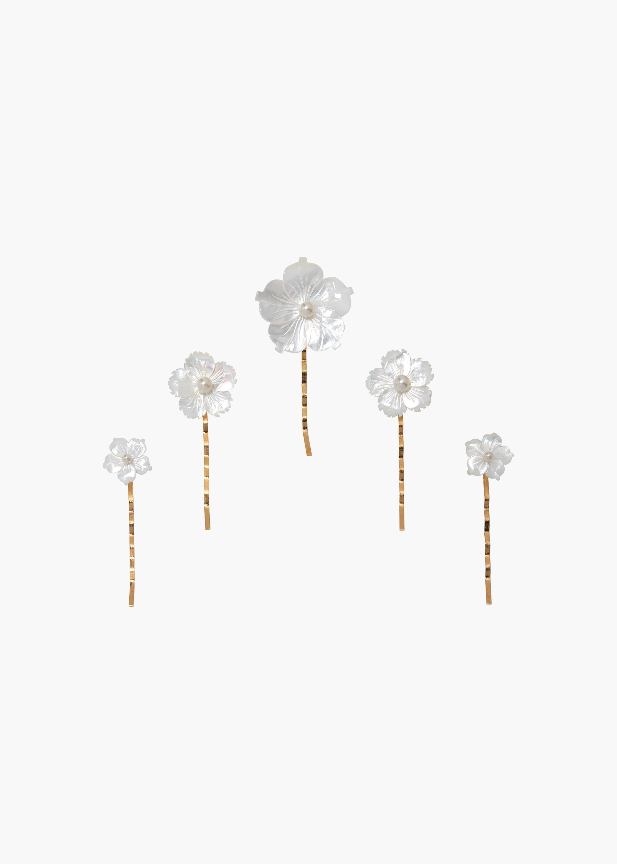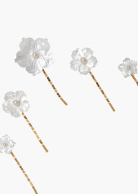 The Zinnia Bobby Pin Set, crafted in ethereal mother of pearl, is the key to creating dreamy hair looks. The set features five bobby pins in varying sizes. Each pin consists of an intricately carved mother of pearl flower and a small central pearl. We love scattering the pins throughout the hair or arranging them on a few strands of pulled back hair. Explore more bobby pins for styling inspiration. Material The Zinnia Bobby Pins are a set of five, made in New York of mother-of-pearl on a durable steel bobby pin, designed to stay firmly in place, once other pins have the hairstyle securely fastened. We recommend treating each pin as you would a piece of jewelry, and storing it in the dust bag when not in use. Avoid contact with water, perfume, and other chemicals, including hairspray, which should be used before placement in the hair.