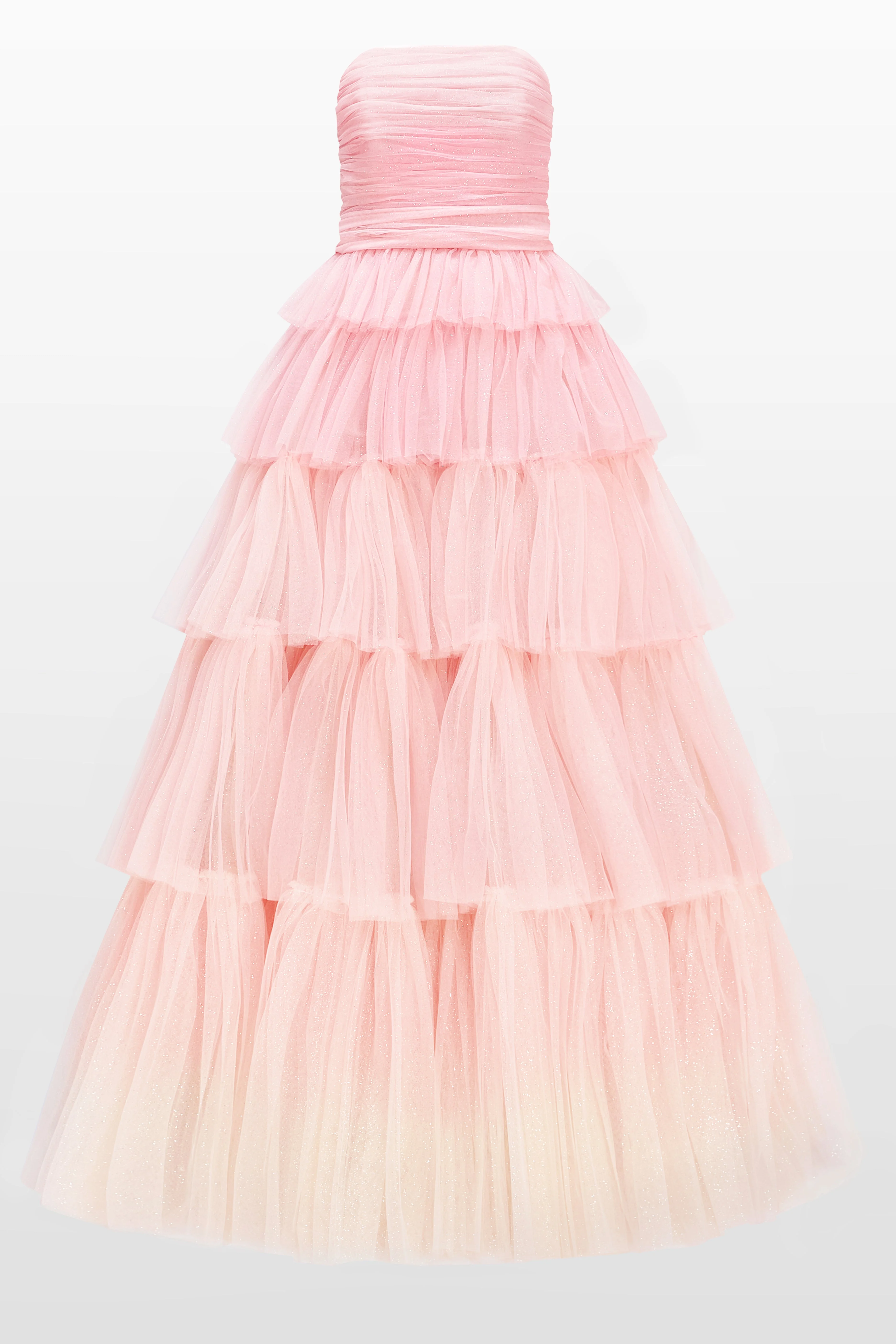 Meet Adore, a gown that exudes romantic drama with its voluminous, layered silhouette. The strapless bodice is softly ruched to enhance and flatter the figure, while tiered tulle cascades into a full, sweeping skirt that moves with airy elegance. The fabric is infused with subtle glitter, adding a light-catching shimmer to every step. A statement piece designed for occasions that call for bold beauty and timeless fairytale charm.