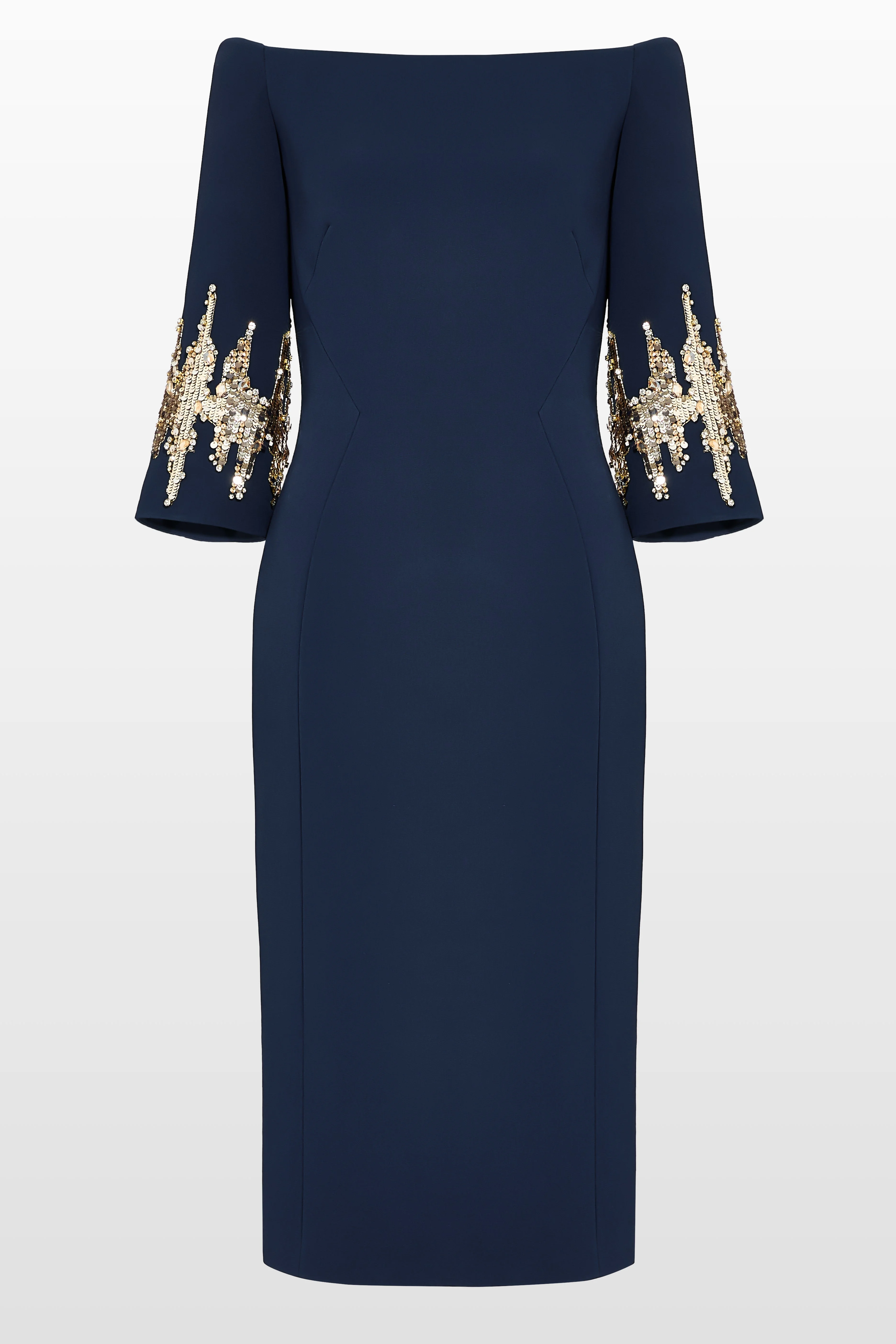 Astra is a true embodiment of red carpet-worthy glamour, crafted for evenings that call for elevated drama. This floor-length designer gown is lavished with intricate beading and crystal embellishments that sparkle across the fabric, catching light with every step. The column silhouette gently skims the body, providing a sleek and statuesque look, while the sculpted cape sleeves introduce a regal element that flows behind with graceful movement. Designed to be worn to black-tie galas, grand evening receptions, or milestone celebrations, Astra is the ultimate luxury gown for once-in-a-lifetime occasions. The blend of ornate detailing and elegant structure ensures a flawless fit and striking visual impact. Whether you're walking into a formal awards night or hosting a charity ball, Astra promises to leave a lasting impression with its blend of poise, presence, and opulence.