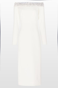 Calypso exudes refined sensuality, an off-shoulder gown designed to embody timeless allure with a modern, breathless pulse. The gracefully draped neckline reveals the collarbones with romantic intention, its edge adorned with delicate embellishments that glimmer like scattered stardust against moonlit skin. The fitted silhouette traces the body with liquid precision, flowing into a sleek mid-length skirt that moves with understated poise, creating elegance in every quiet step. Perfect for black-tie weddings, champagne receptions or rooftop soirees at twilight, Calypso thrives in settings where refinement is felt rather than announced. Style with pearl or crystal earrings, strappy sandals and softly waved hair draped over one shoulder to echo its fluid shape. A slim metallic clutch or satin minaudiere enhances the sculptural line, while a soft blush lip completes the tone. Calypso is not a gown of theatrics — it is a study in poise, polished, magnetic and unforgettable in its restraint.