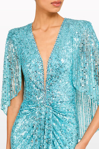 The Carrie is effortlessly refined; this gown blends fluid movement with high-impact shine. Featuring a softly draped bodice, a plunging neckline, and cape-style sleeves, it skims and elongates the silhouette with modern ease. Precision-placed sequins cascade from shoulder to hem, creating vertical lines that enhance the sense of length and light play. Gentle gathering at the waist defines the figure, while the overall design delivers a clean, contemporary statement for unforgettable occasions.