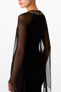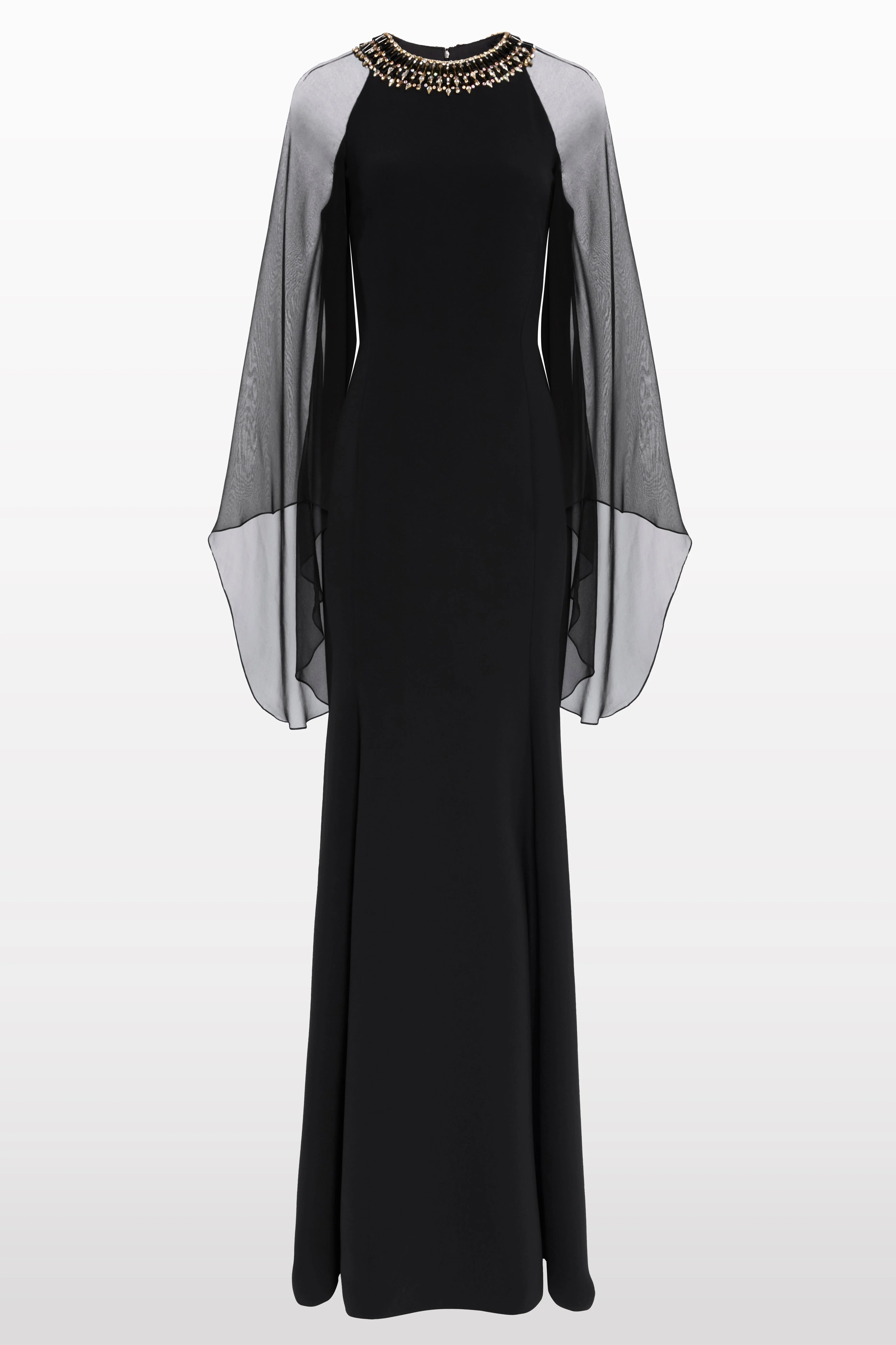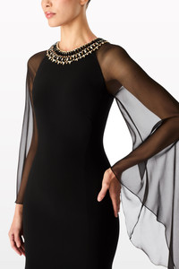 Charma is a dramatic floor-length gown that blends sculptural elegance with soft ethereal details. The figure-skimming bodice is tailored to perfection, creating a statuesque silhouette that flows gracefully into a floor-length hem. Sheer billowing sleeves introduce lightness and movement, their delicate fabric catching the light for a luminous effect. The neckline is accented with hand-applied crystal embellishments, adding subtle contrast and refined shine. This gown is ideal for black-tie weddings, upscale receptions, or any occasion where elegance meets bold design. Charma is for the modern woman who embraces both strength and softness in her eveningwear — a luxurious gown that combines high-fashion tailoring with romantic fluidity.