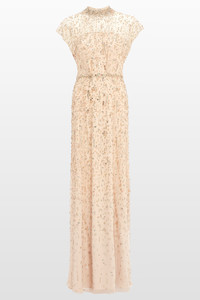 Delicate yet defined, the Crystal Drop gown captures the romance of a bygone era with a modern twist. A sheer, embellished overlay graces the shoulders and neckline, creating a soft illusion effect that floats above a tailored bodice. Intricate beading cascades down the silhouette, gradually dispersing into a fluid skirt that glides with quiet elegance. Ideal for formal soirees, weddings, or evening events where timeless beauty takes center stage.