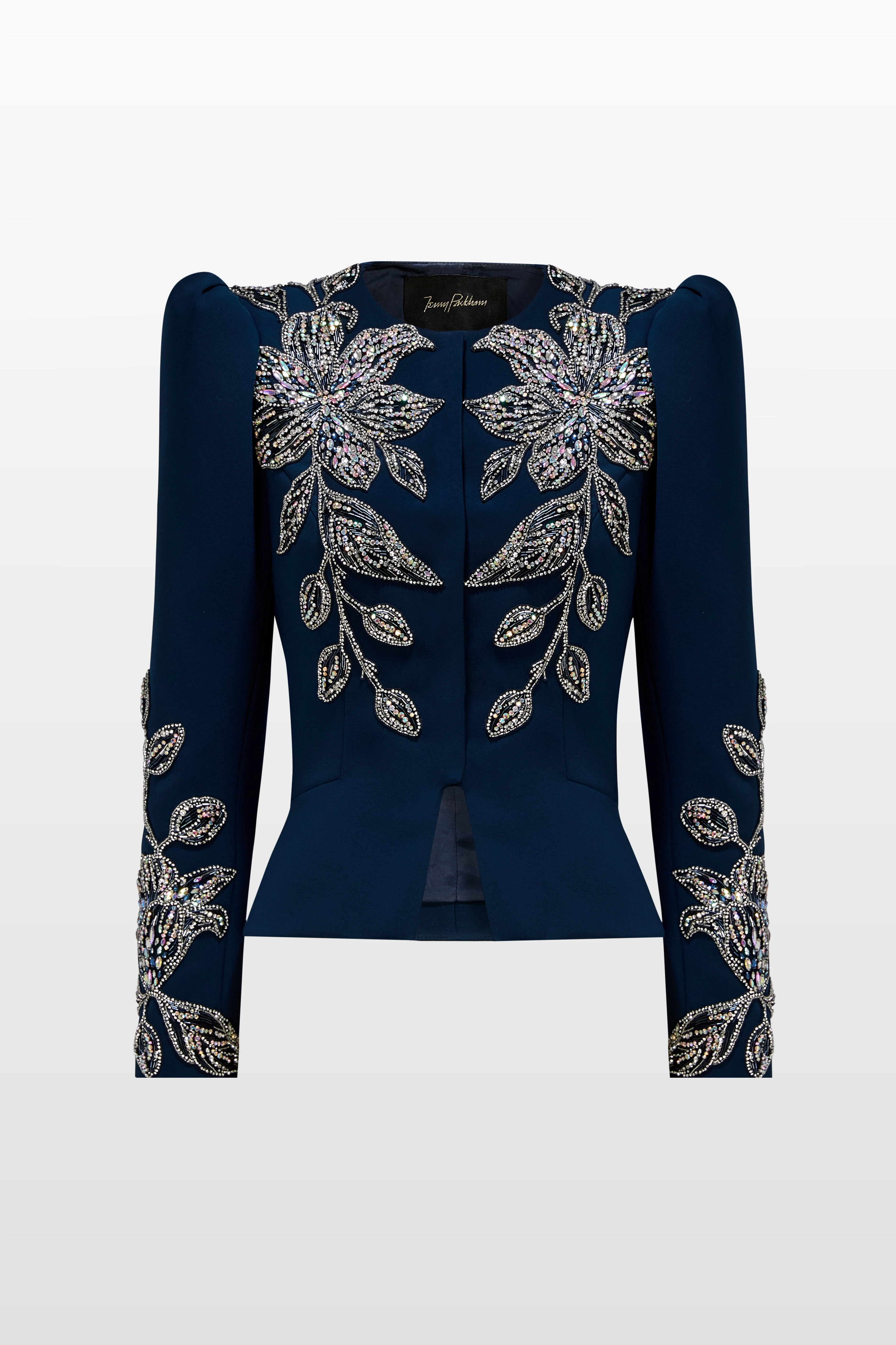 Exude confident sophistication in this tailored jacket, a perfect blend of sharp structure and intricate embellishment. The design features a flattering fitted silhouette with softly padded shoulders and a peplum waist that enhances the figure. Sparkling floral beadwork cascades across the bodice and sleeves, creating a striking, light-catching effect that elevates any ensemble. Designed for occasions where polished elegance meets bold, statement-making style.