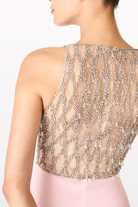 Sleek sophistication meets intricate embellishment in Dewdrop, a striking gown designed for modern elegance. This full-length dress features an embellished bodice, adorned with intricate crystal embroidery that forms a delicate, mesh-like effect across the upper body. The high neckline and racer-style cut lend a contemporary, athletic-inspired edge, offering structure and contrast to the soft sparkle. Below, the skirt flows in a smooth, uninterrupted column, creating a clean, minimalist silhouette that balances the ornate detailing above. The thoughtful juxtaposition of textures makes this gown a standout option for evening events that call for originality and poise. Ideal for modern weddings, art gallery openings, or fashion-forward black-tie affairs, Dewdrop captures attention without overwhelming. Whether styled with sleek hair and bold earrings or kept minimalist with understated heels, this gown delivers sharp glamour for those with an eye for detail.