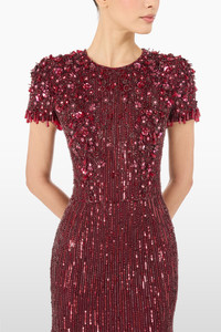 This evening gown is a striking showcase of artistry, featuring short sleeves adorned with intricate beadwork that adds depth and texture. Vertical sequins elongate the silhouette, while the fitted bodice flows seamlessly into a floor-length skirt that moves with fluid elegance. The design balances strong structure with delicate embellishment, resulting in a powerful yet graceful statement. Perfect for gala dinners, black-tie occasions, or red carpet appearances, this gown ensures a show-stopping entrance.
