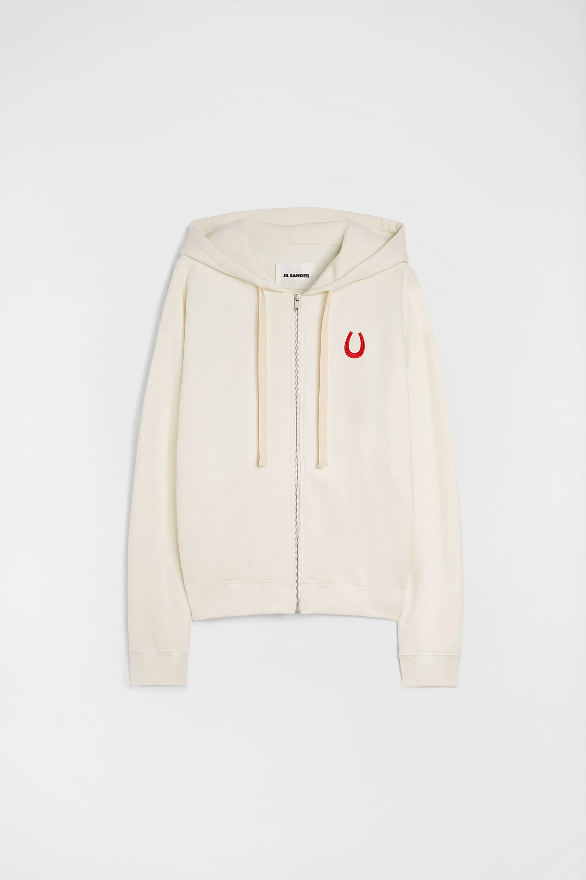 Long-sleeved lightweight cotton terry hooded sweatshirt with front zip and embroidered horseshoe Details - regular fit - dropped shoulders - front zip closure - hood with drawstring - horseshoe embroidered on chest - lightweight cotton terry - 92% cotton 8% elastane-spandex - made in Italy - StyleID: J54HG0001J20128103 Care - dry clean only - iron with care Fit - model is 187cm/6'1" and is wearing a size M - Please note that the physical label of the item will show the international size