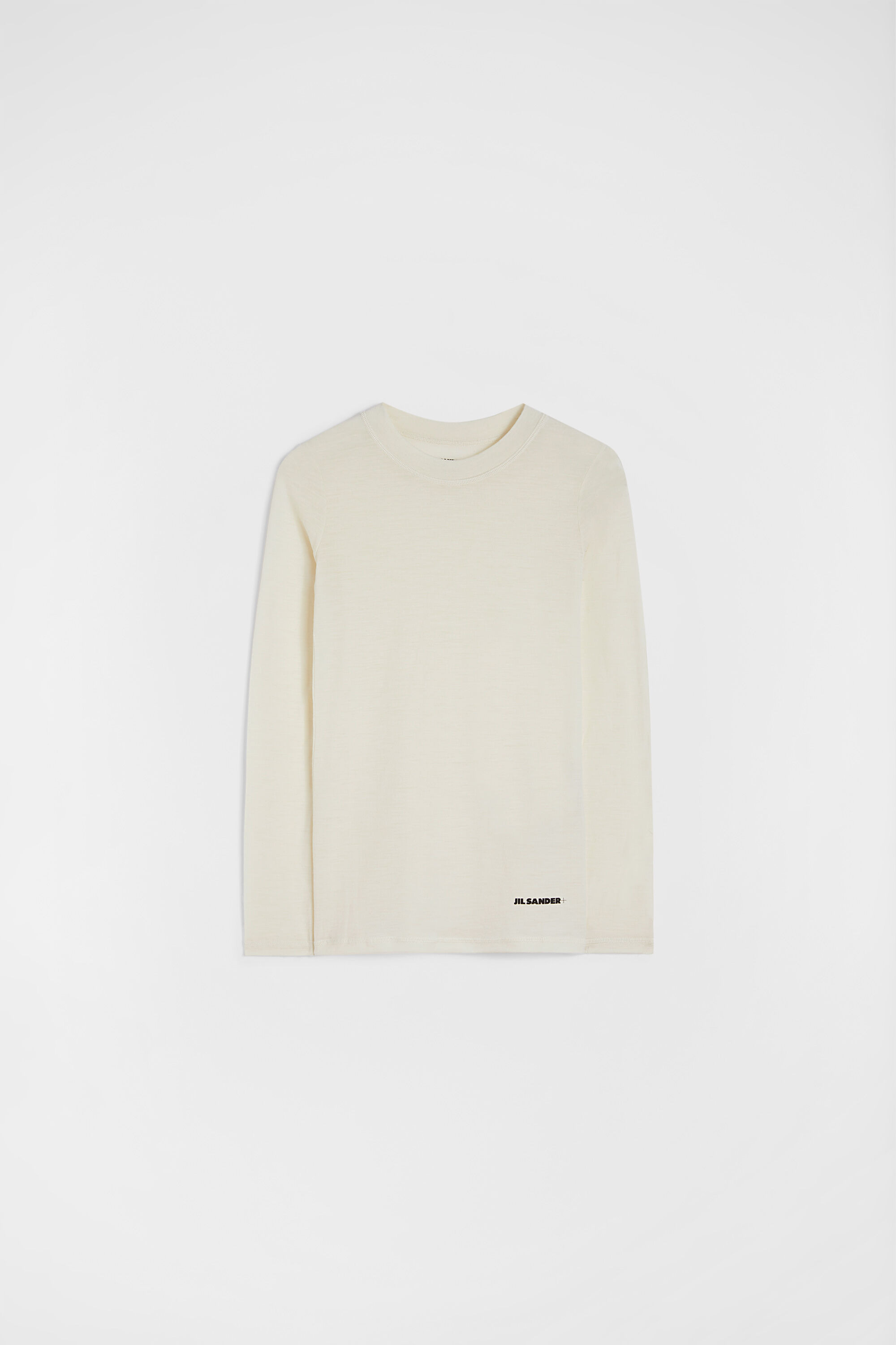 Cotton jersey t-shirt with printed Jil Sander+ logo on bottom side Details - slim fitted - long sleeves - round neck - bottom side printed Jil Sander+ logo - 55% polyester, 45% virgin wool - made in Italy - StyleID: J40GC0022J70021102 Care - dry clean only Fit - model is 177cm/5'9" and is wearing a size S - Please note that the physical label of the item will show the international size