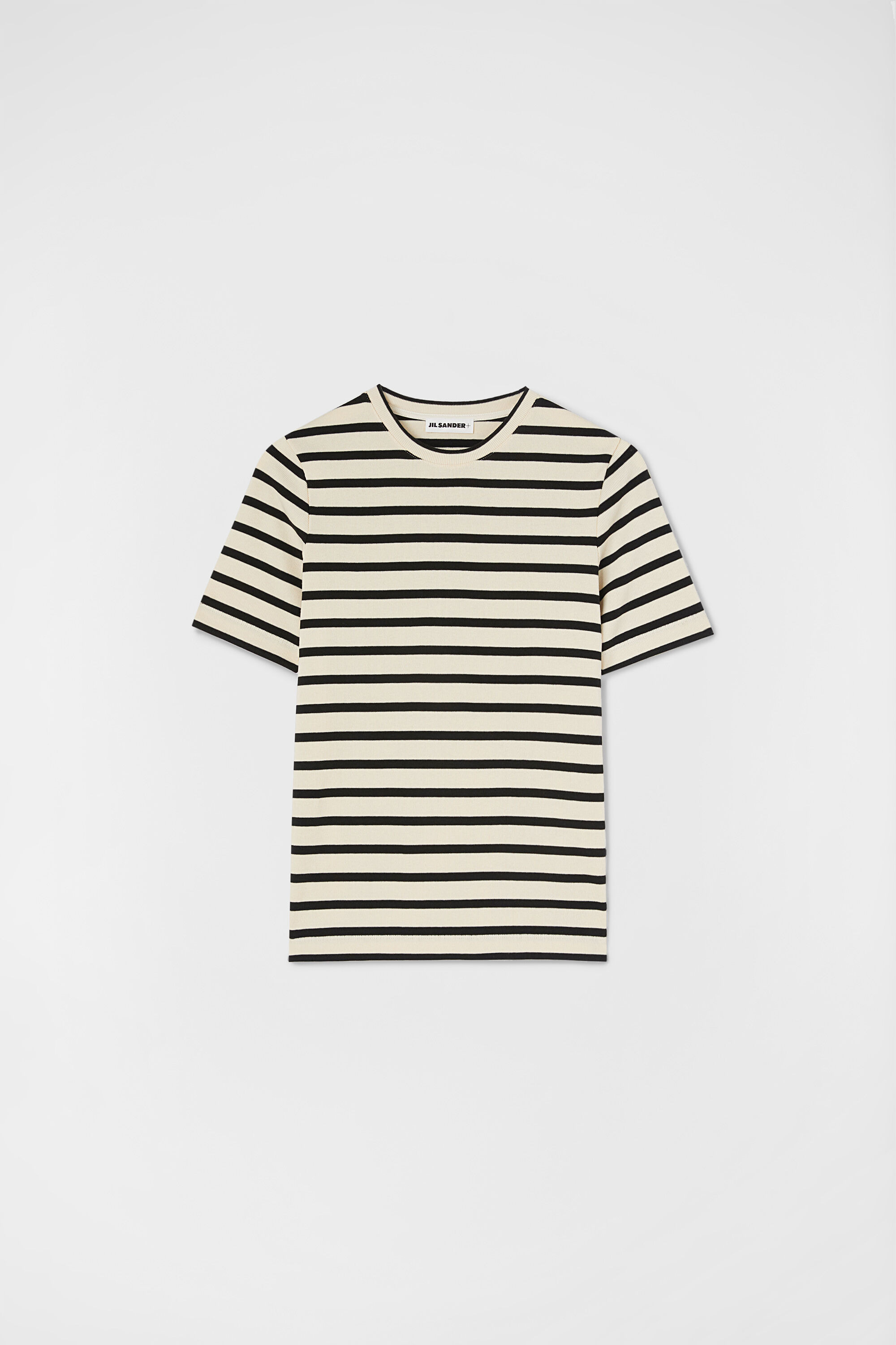 Short-sleeved cotton jersey t-shirt with Jil Sander+ logo label stitched on back Details - oversized fit and dropped shoulders - two-toned stripes - Jil Sander+ logo label top-stitched on back - ribbed cotton jersey - 100% cotton - made in Italy - StyleID: J47GC0109J46497080 Care - hand wash - iron with care Fit - model is 187cm/6'1" and is wearing a size M - Please note that the physical label of the item will show the international size