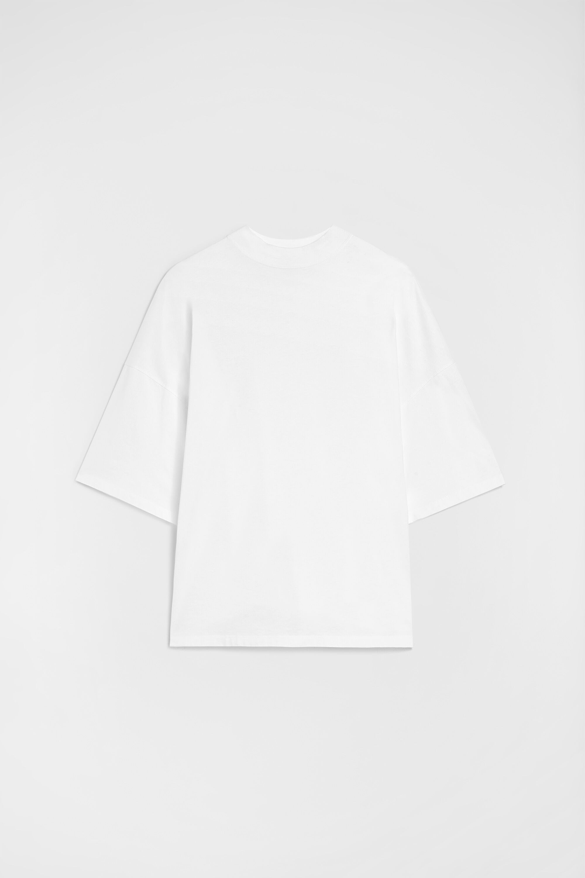 Oversized cotton t-shirt with mock neck and short sleeves Details - oversized fit and boxy shape - we recommend taking one size down - dropped shoulders - ribbed mock neck - short sleeves - 100% cotton - made in Portugal - StyleID: J21GC0005J45084100 Care - hand wash - iron with care Fit - model is 187cm/6'2" and is wearing a size M - Please note that the physical label of the item will show the international size