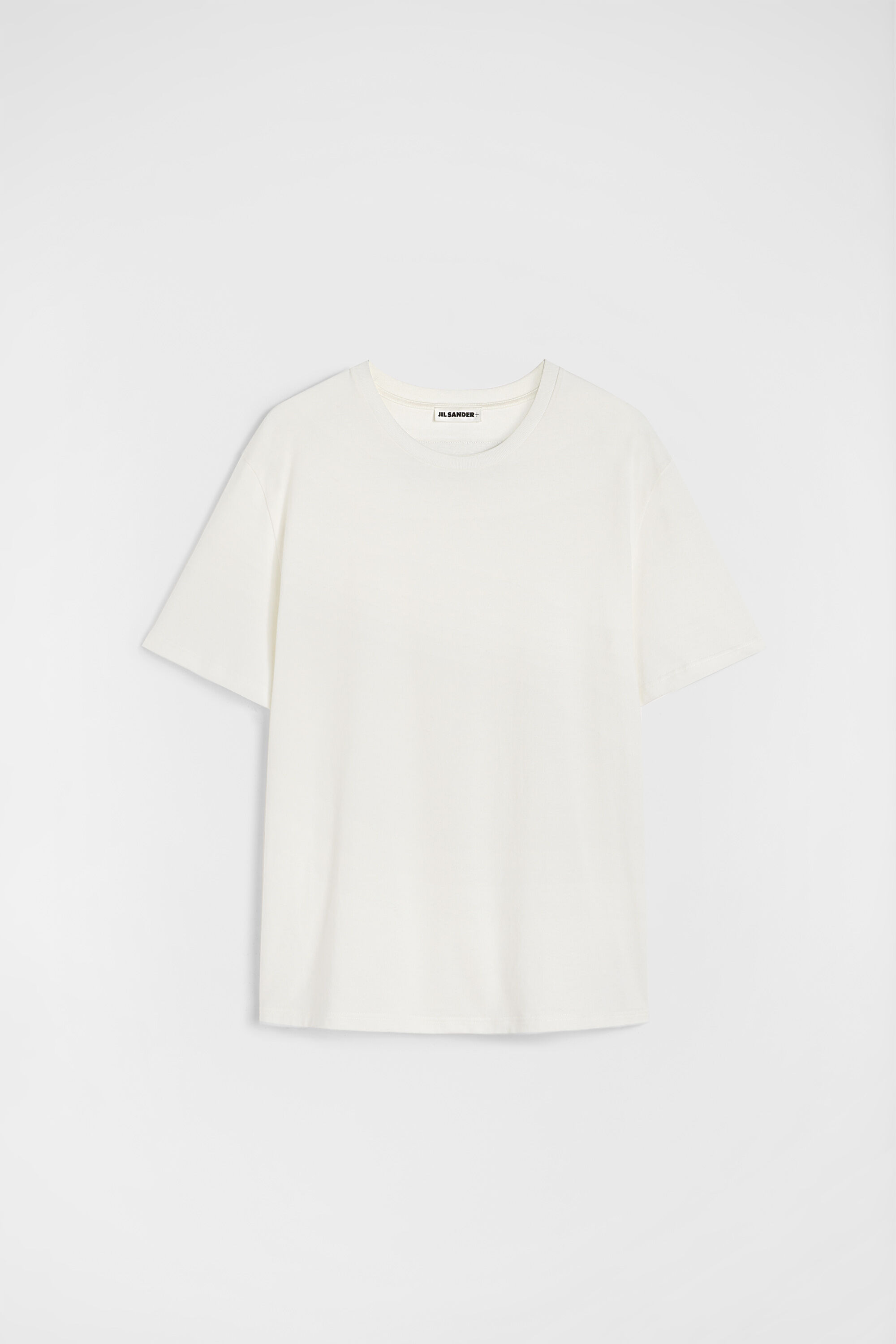 Short-sleeved lightweight compact cotton jersey t-shirt with back leather patch with embossed Jil Sander+ logo Details - relaxed fit - dropped shoulders - back leather patch with embossed Jil Sander+ logo - lightweight compact cotton jersey - 100% cotton - made in Italy - StyleID: J47GC0153J20103102 Care - hand wash - iron with care Fit - model is 187cm/6'1" and is wearing a size M - Please note that the physical label of the item will show the international size